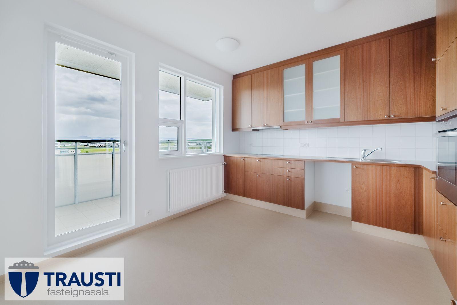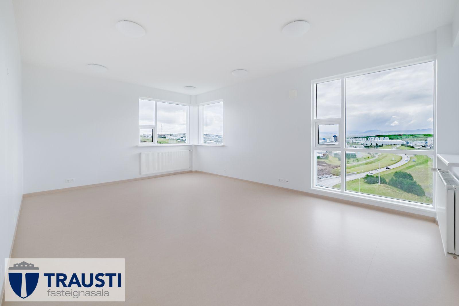 Stofa/borðstofa er björt með glugga í suður og útgengi út á rúmgóðar suðaustur svalir með flísum á gólfi. Fallegt útsýni.