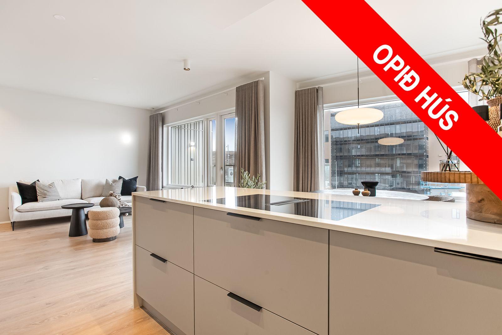 Eldhús: Parket á gólfi, gott skápa- og borðpláss. Innréttingin er frá Selós, með matt beige og grábrúnar framhliðar. Borðplötur eru úr 20 mm Quartz-steini með undirlímdum vaski úr stáli. Eldhústæki eru frá AEG. Innbyggður ísskápur, frystir og uppþvottavél fylgja. Skúffur eru með mjúklokunarbúnaði og LED-lýsing er undir efri skápum. Höldur eru svartar griphöldur frá Selós.