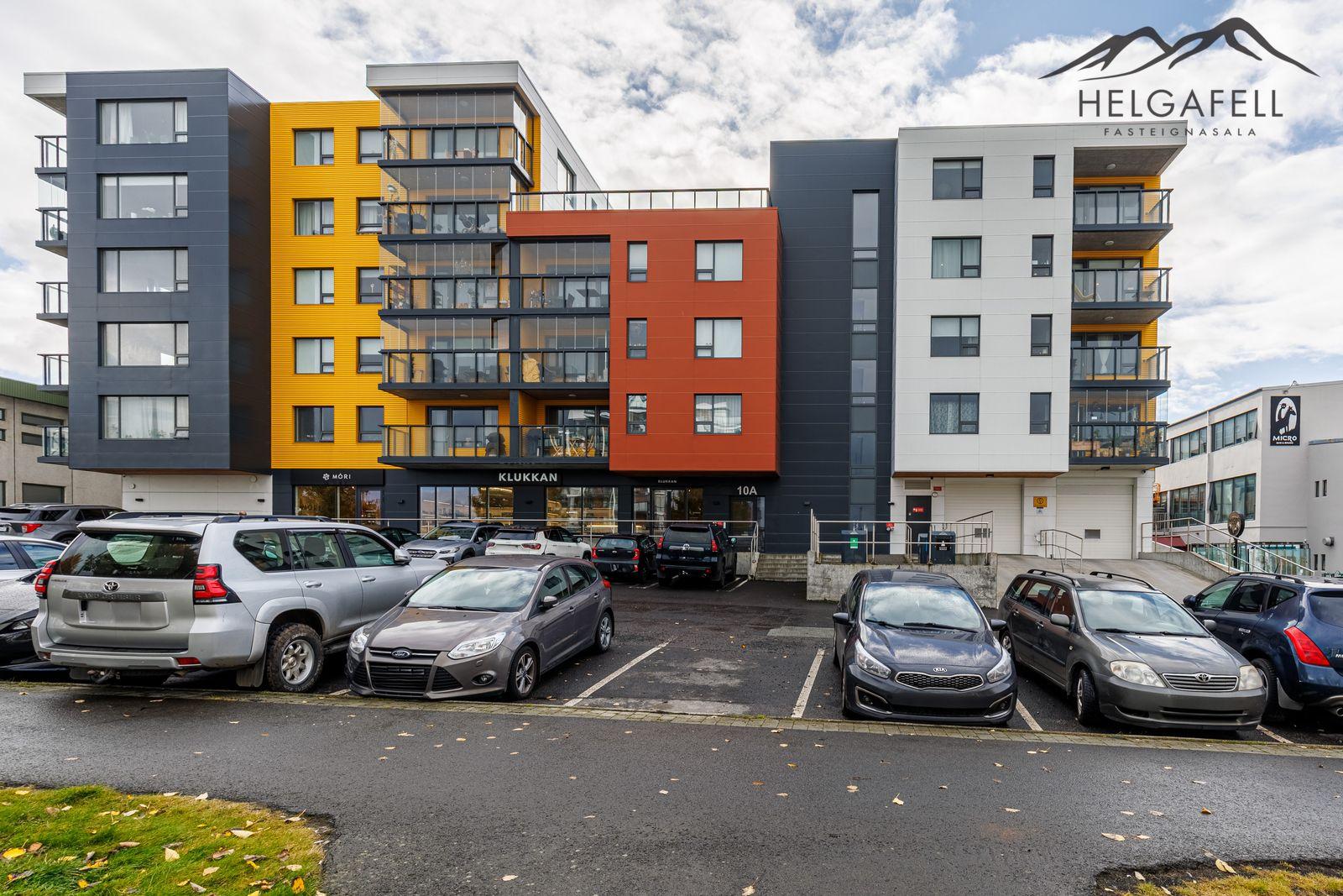 Húsið: Húsið var byggt árið 2020 af JÁVERK ehf. Við hönnun hússins var tekið mið af því að lágmarka viðhaldið. Húsið er einangrað að utan, klætt með sléttu og báruðu áli og gluggar eru ál-tré. Innréttingar og eldhústæki frá Bræðrunum Ormsson – HTH innréttingar. Flísar á baðherbergjum frá Álfaborg og innihurðir frá Parka. Nýbýlavegur 10A og 10B er tvö stigahús með samtals 47 íbúðum. Lyfta er í báðum stigahúsum. Húsið er sex hæðir og er efri bílageymsla á fyrstu hæð ásamt verslunarrými. Íbúðirnar eru svo á 2. - 6. hæð. Í húsinu eru 2ja, 3ja og 4ra herbergja íbúðir af ýmsum stærðum. Íbúðum á jarðhæð og 1. hæð fylgir sér afnotaréttur þar sem verður verönd. Gott útsýni er frá mörgum íbúðum.