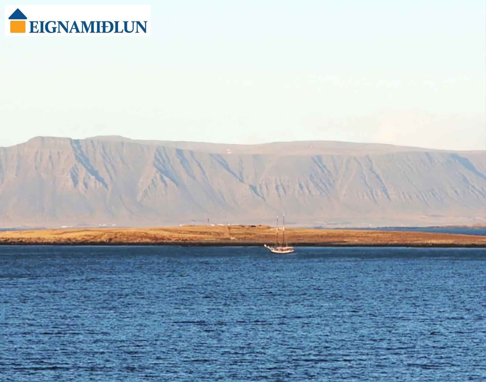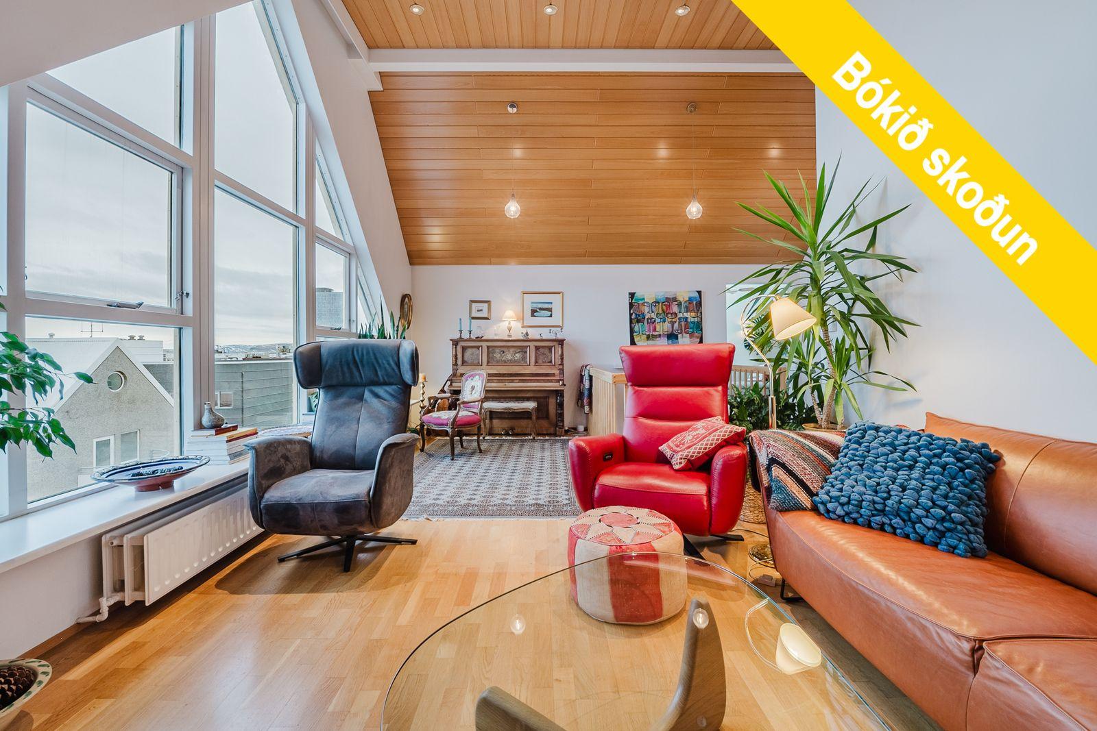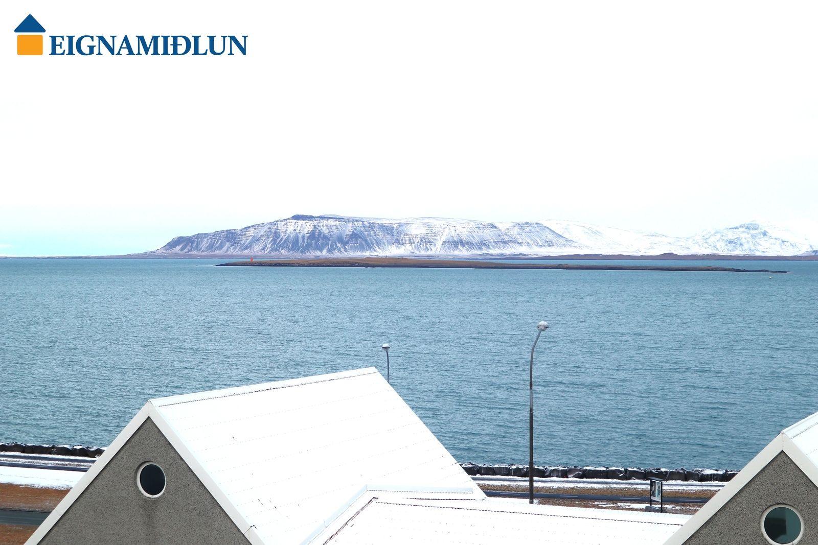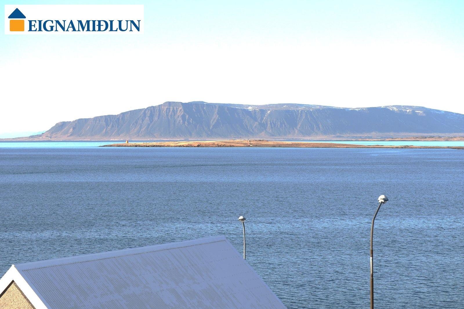 2 hæð: Gengið er upp teppalagðar tröppur úr holi. Komið er upp í stóra, opna og bjarta stofu með einstöku útsýni yfir faxaflóann. Úr stofunni er gengið inn í rúmgott svefnherbergi með góðum skápum og sérbaðherbergi með baðkari, nýjar flísar á gólfi og ljósar flísar á veggjum. Við hinn enda stofunar er yfirbyggður, flísalagður sólskáli, úr honum er gengið út á svalir sem snúa til norðurs og eru með glæsilegt útsýni yfir Faxaflóann. Parket er á gólfum að undanskyldu baðherbergi og sólstofu.