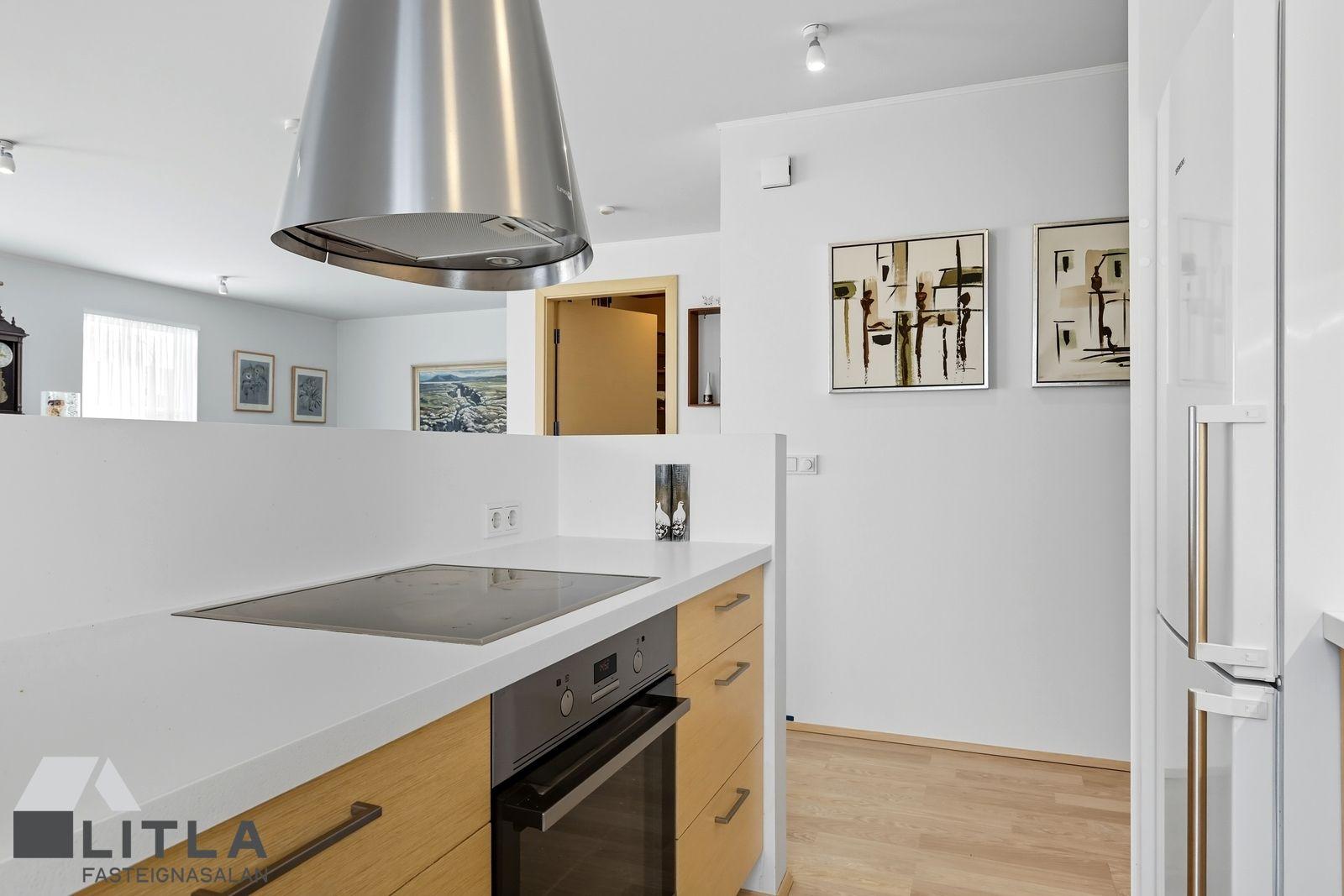 Eldhús með ljósri réttingu, helluborði, bakaraofni og háf. Stofa og eldhús eru í sameiginlegu rými
