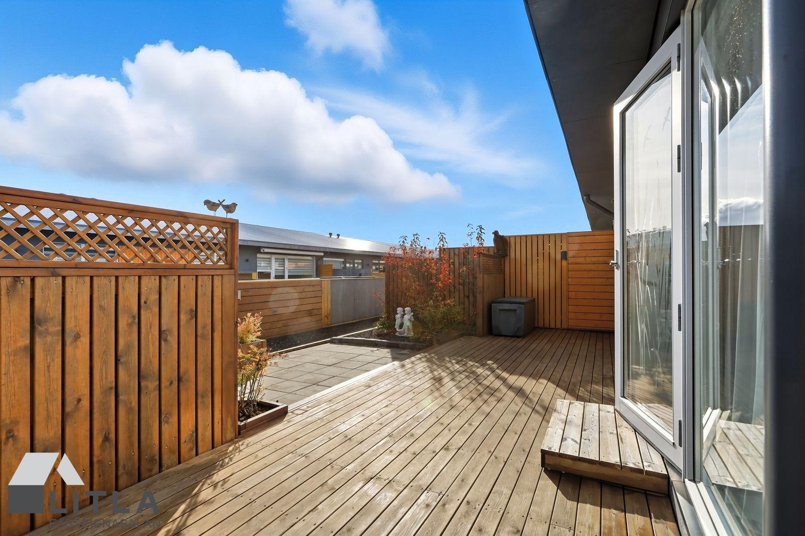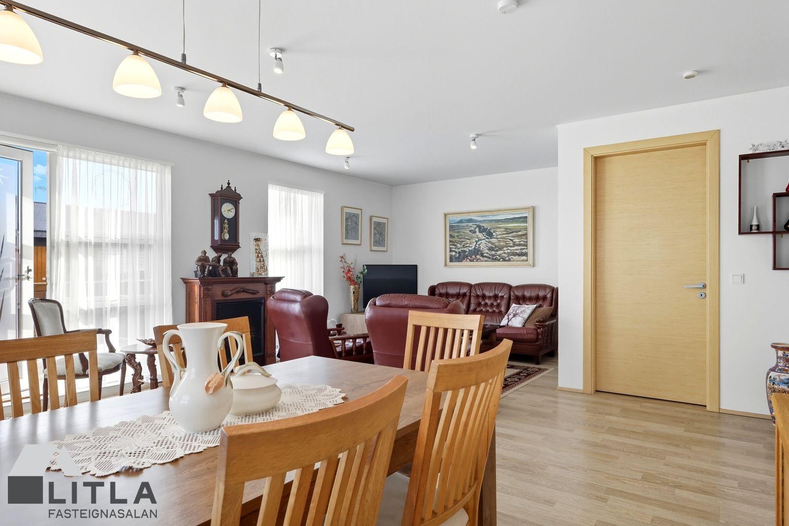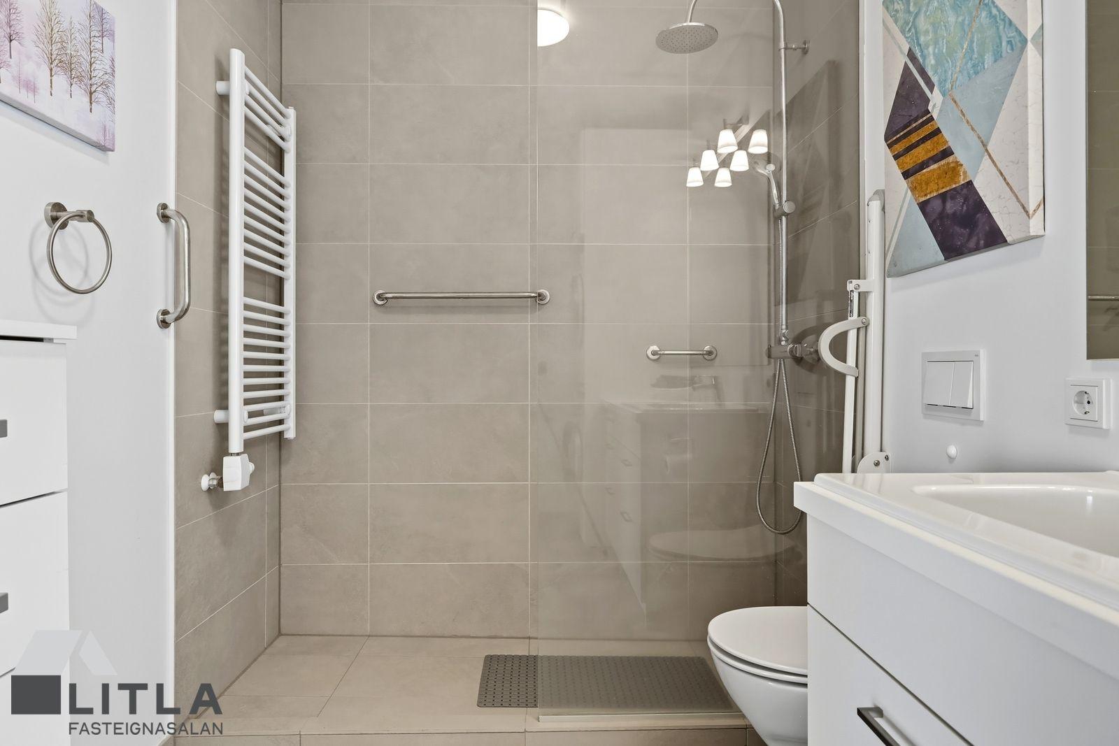 Lítið mál að bæta við 3ja svefnherberginuBaðherbergi er stórt með inngengri sturtu, flísum á gólfi og í sturturými, ljósri innréttingu, upphengdu salerni,