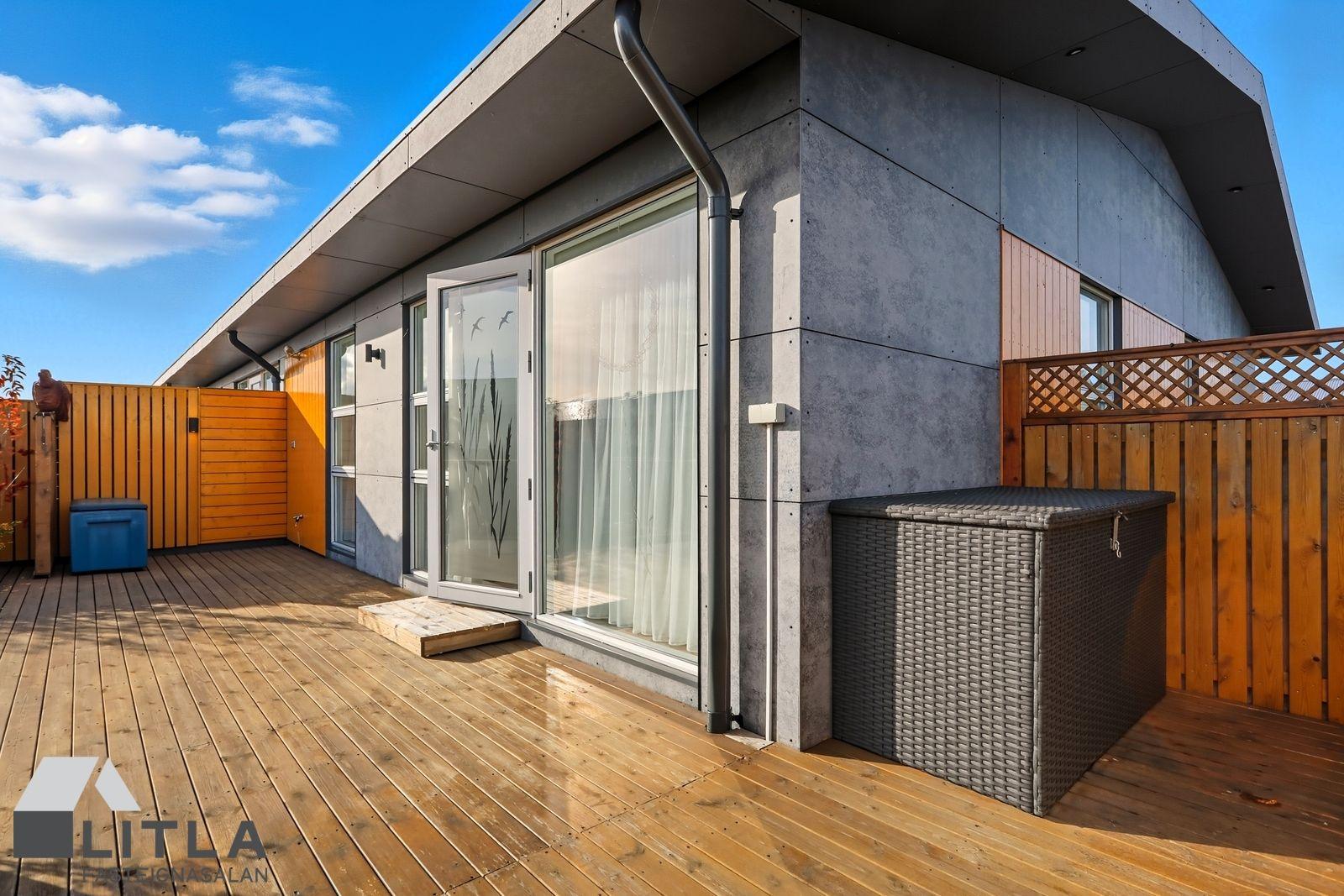 Húsið er klætt með Etemit stone pane og timbri, á þaki er litað járn