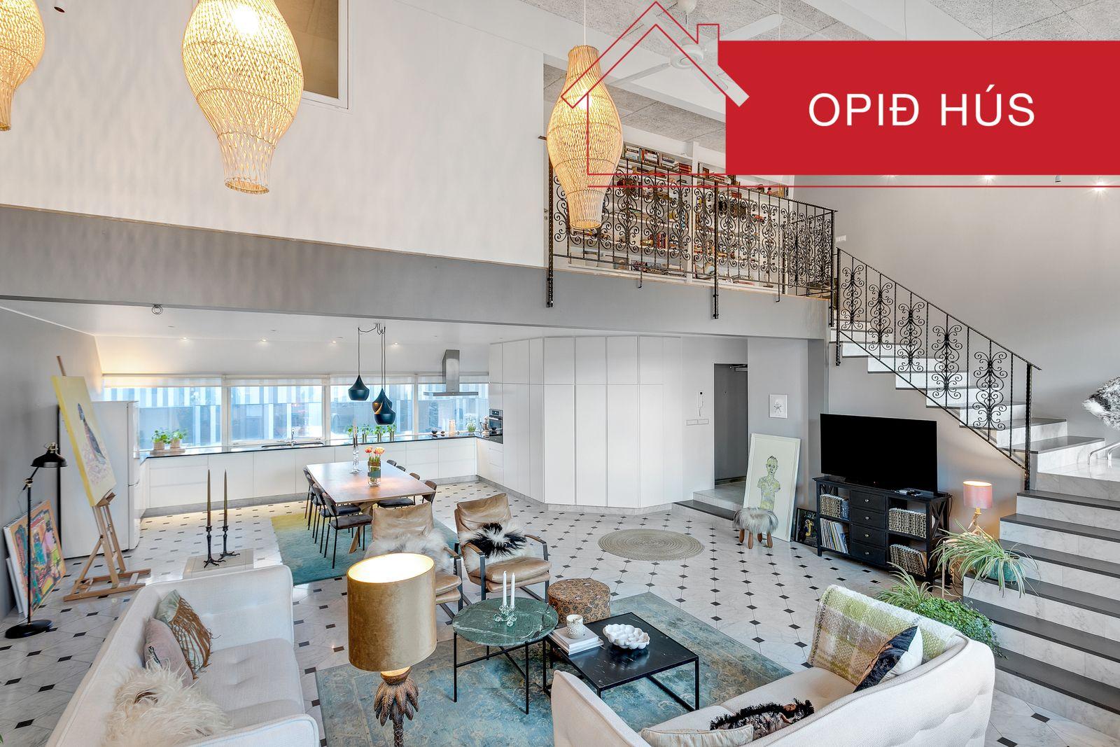 Hér getur þú gengið í gegnum eignina í 3D: Ýtið hér// Mikil lofthæð í alrými.