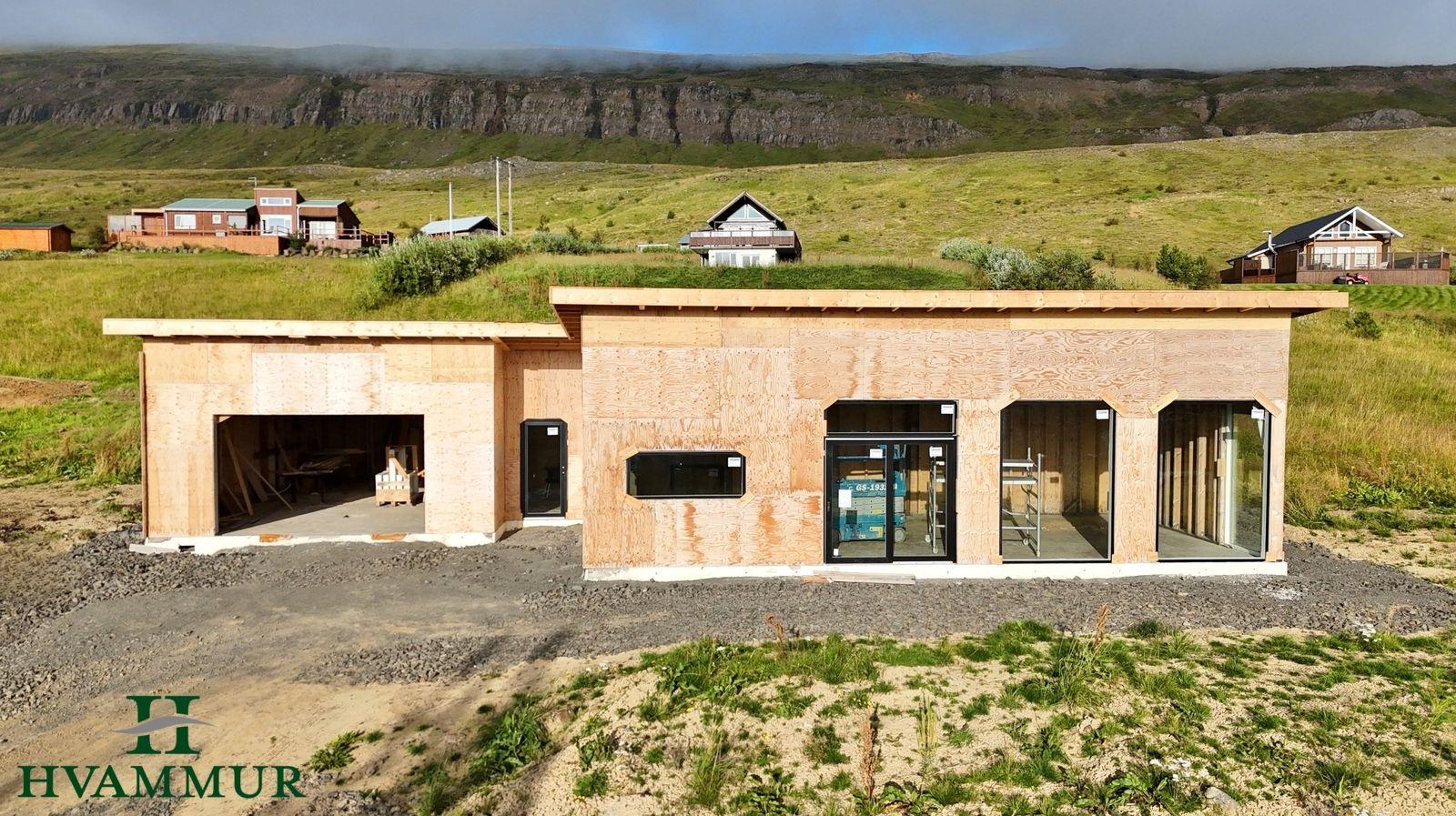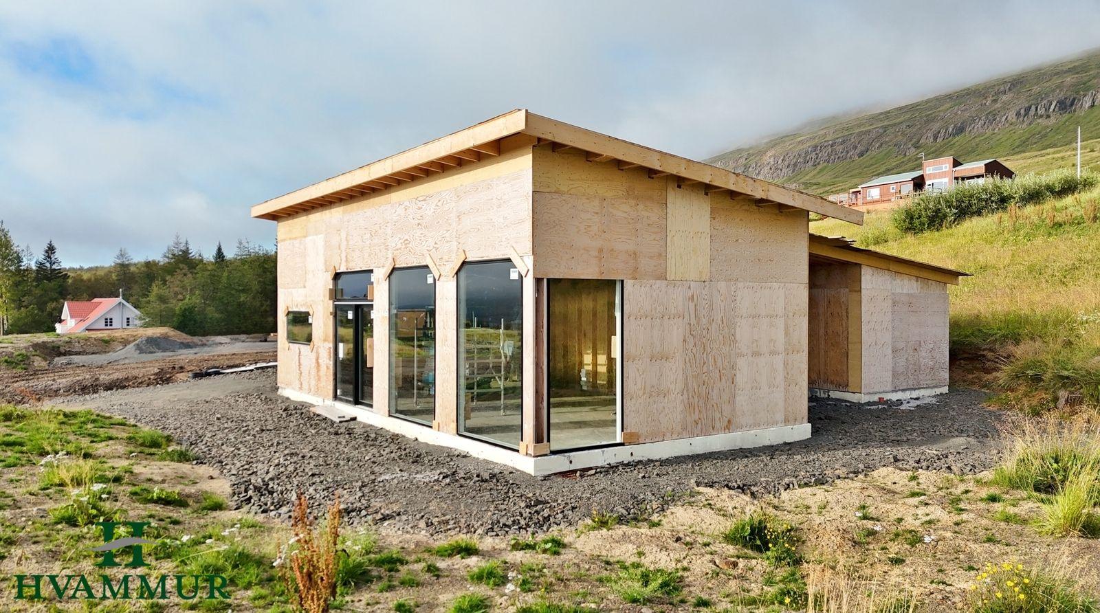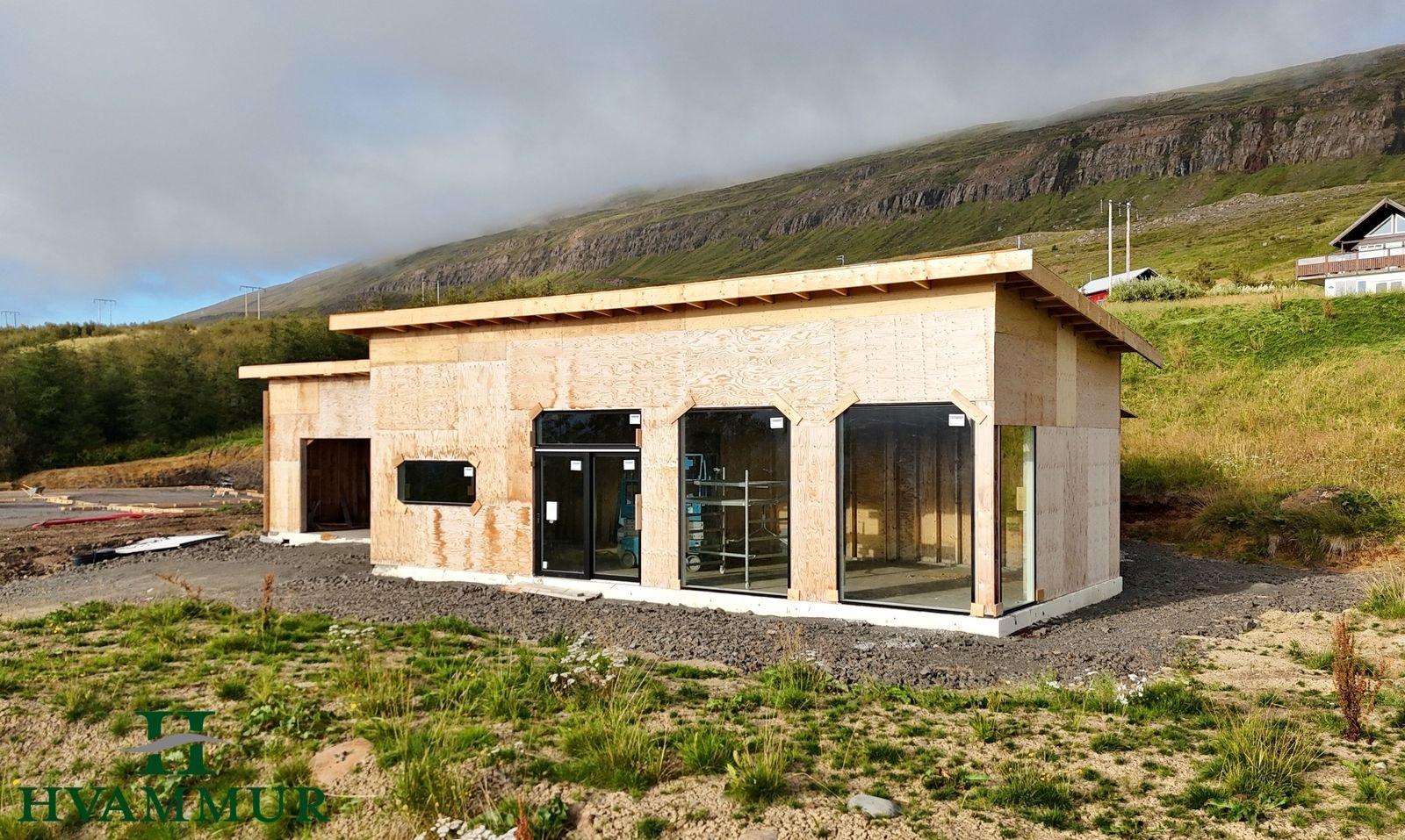 Húsið afhendist fullbúið að utan með steyptu bílaplani og stétt og steyptri verönd á suðurhliðinni, lóð verður grófjöfnuð. Að innan verður búið að einangra og klæða bæði útveggi og þak, reisa alla innveggi og klæða þá með gipsi. - Húsið er timburhús á steyptri plötu og með einhalla þaki.