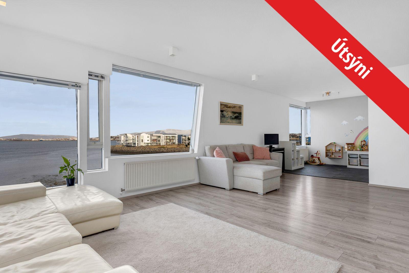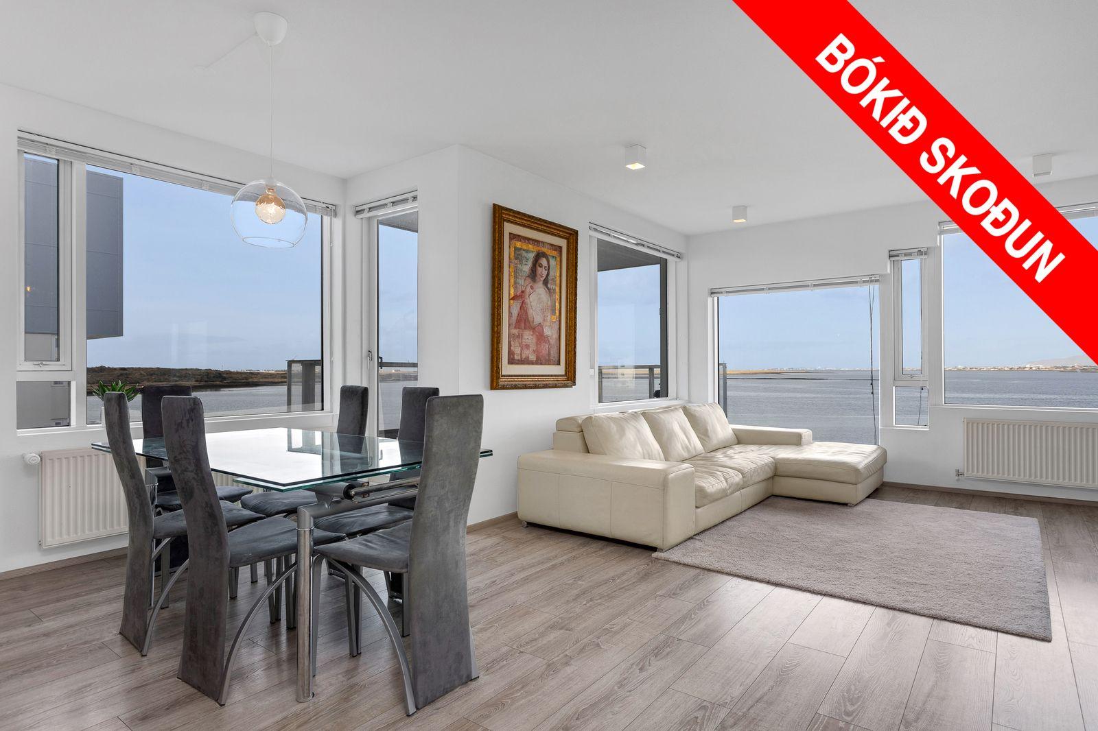 Stofa/borðstofa: Er opin og björt með stórum gluggum og glæsilegu sjávarútsýni. Frá stofu er gengið út á rúmgóðar vestursvalir.