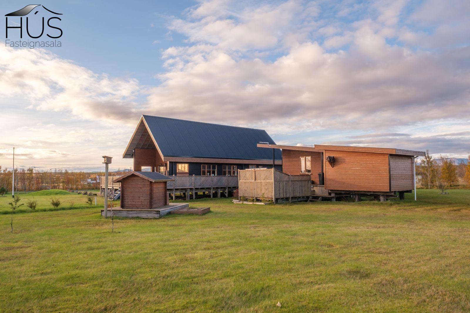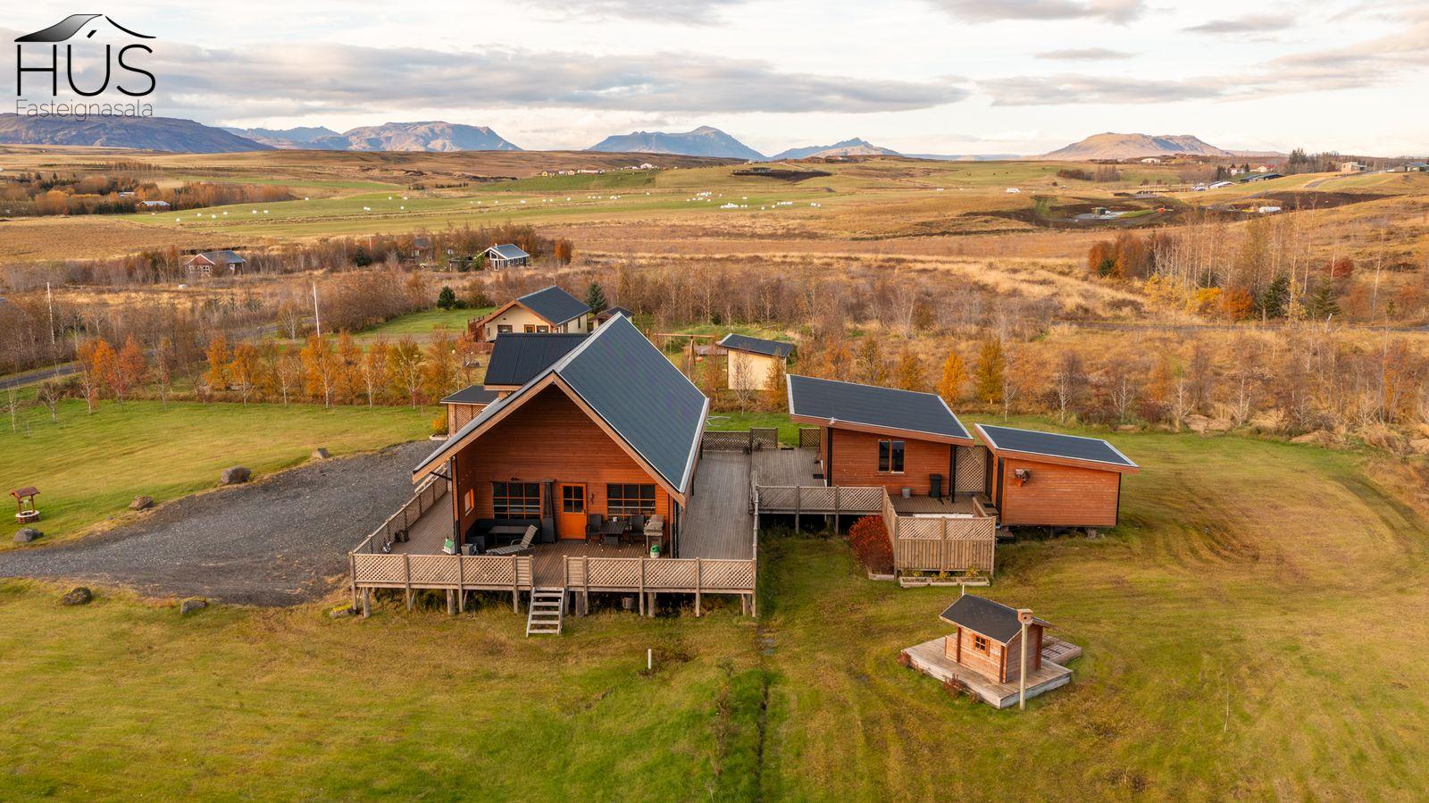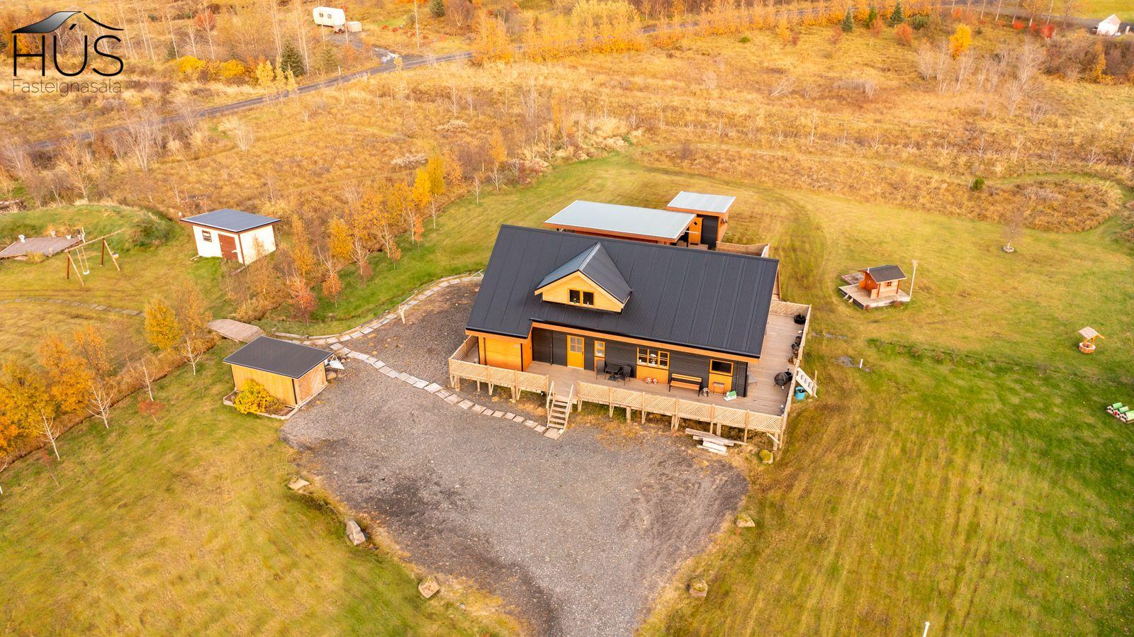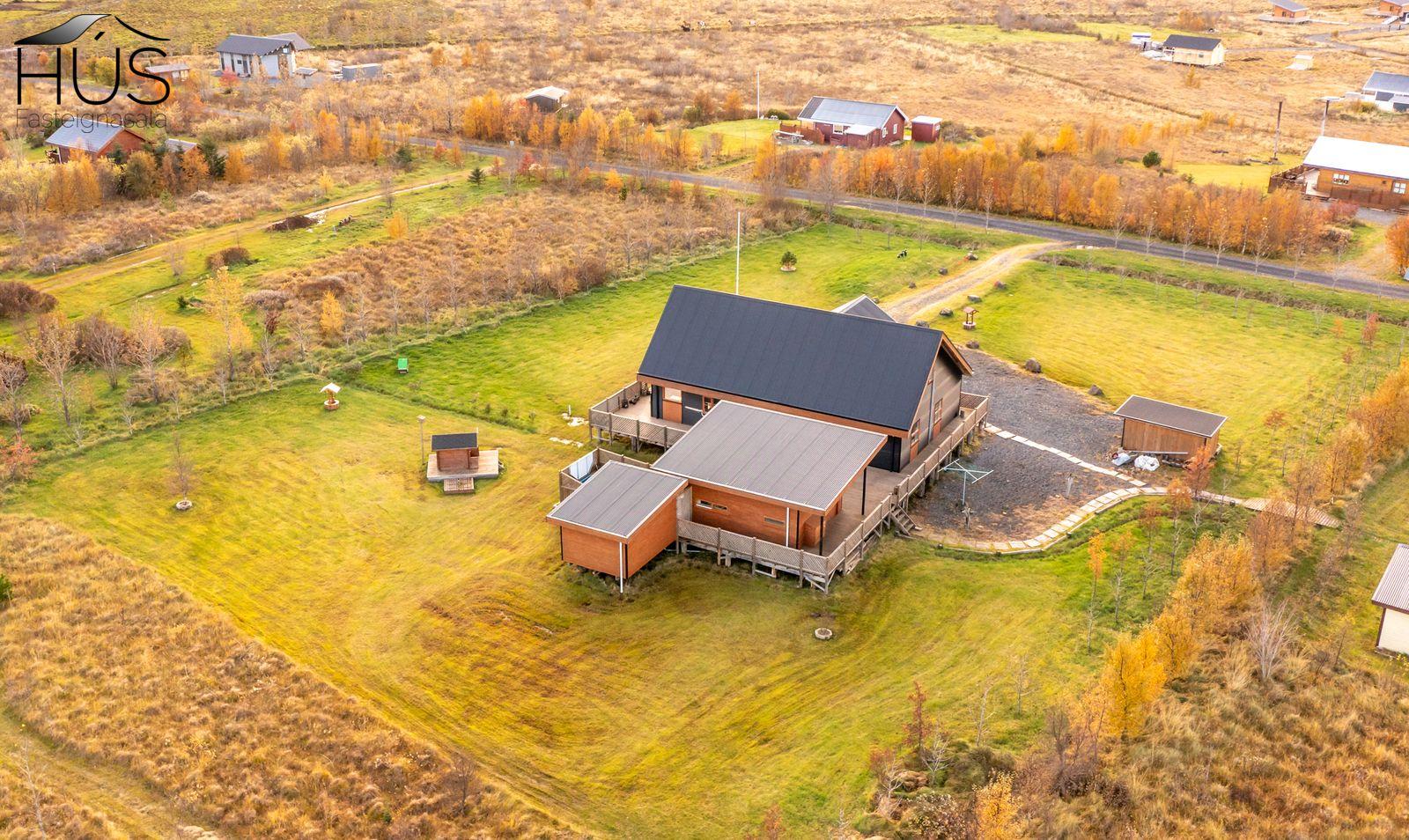 Halldóra Kristín Ágústsdóttir löggiltur fasteignasali sími 8611105- dora@husfasteign.is og Hús fasteignasala kynna í almennri sölu: Glæsilegt bjart og vel skipulagt sumarhús með 4 svefnherbergjum við Reykholt í Biskupstungum. Um er að ræða 122 m2 sumarhús byggt árið 2018, ásamt 30 m2 gesta húsi byggðu árið 2016 og 15 m2 útigeymslu. Húsið er klætt með álklæðningu, mjög rúmgóður timburpallur meðfram öllu húsinu með heitum potti. Einstakt umhverfi. Fallegt útsýni. Frábær staðsetning, 5 mínútur að keyra í Reykholt, stutt á Flúðir, Gullfoss og Geysi. Lóðin er eignalóð og er 5267 m2. Næg bílastæði og hleðslustöð fyrir rafmagnsbíla.