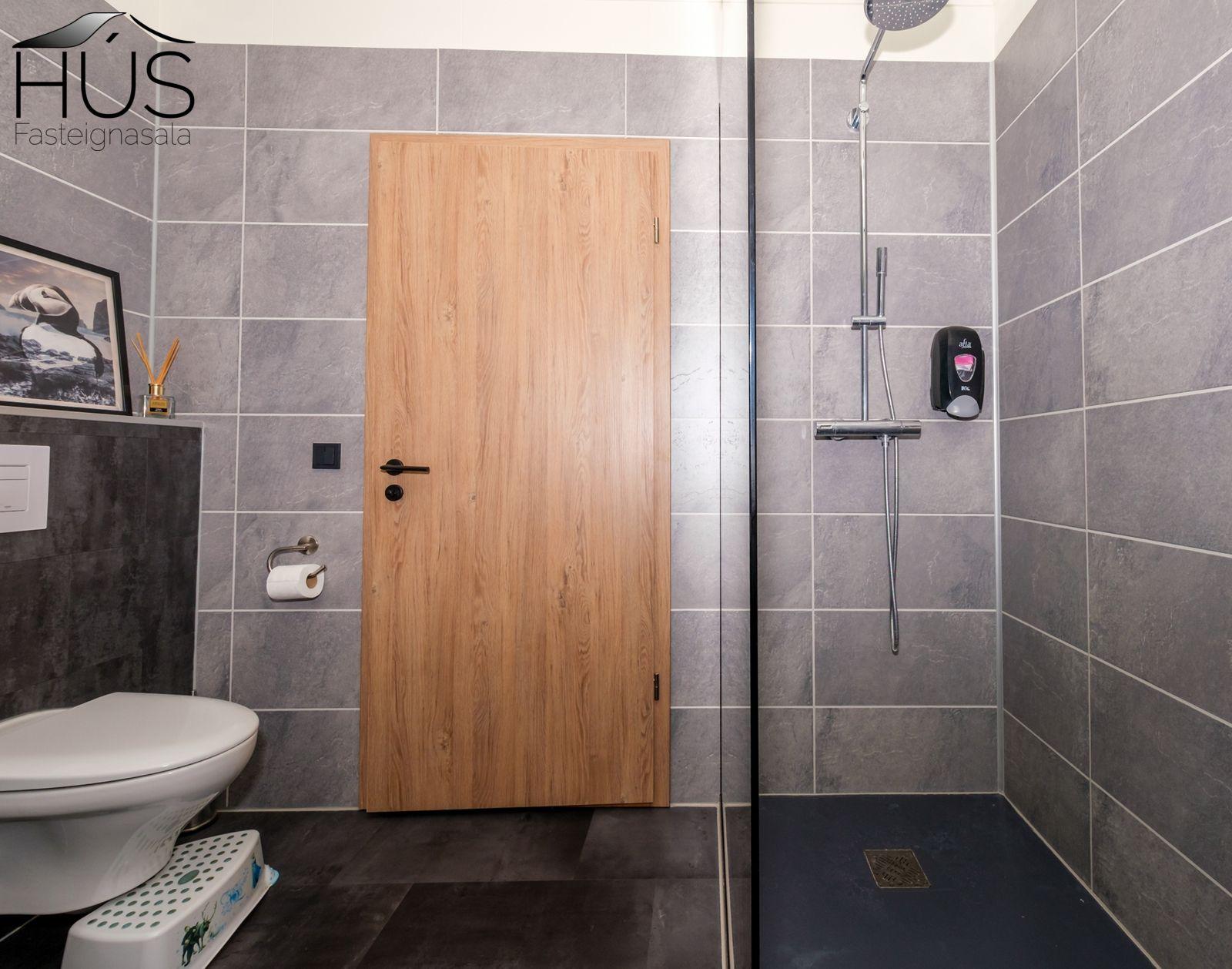 Baðherbergi: Flísar á gólfi og fibo plötur á veggjum, walk in sturta, innrétting, upphengt wc, opnanlegur gluggi.
