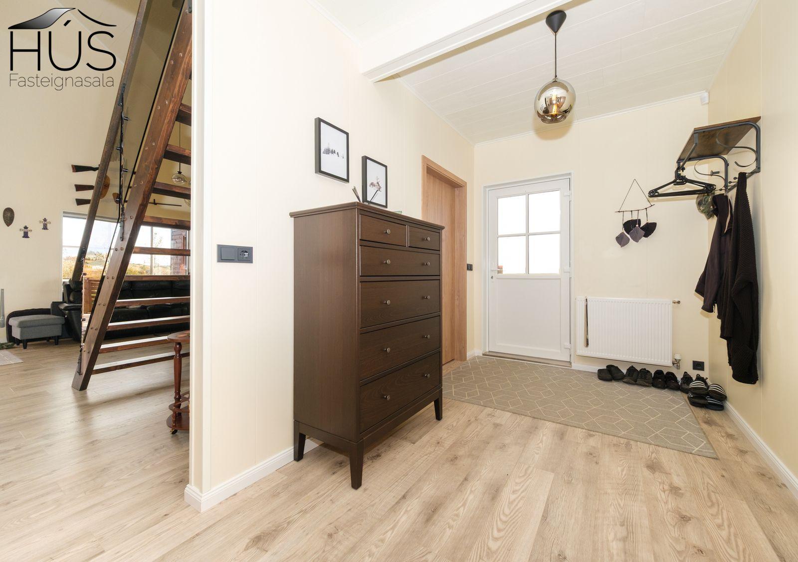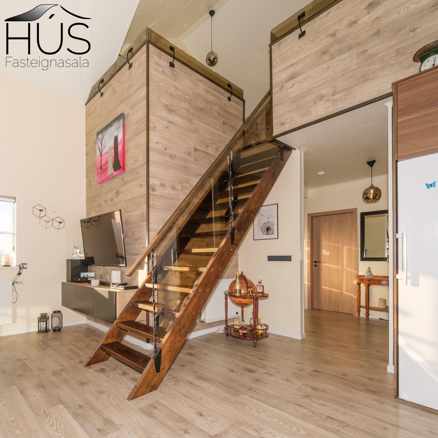 Stofa: Parket á gólfi, opið inn í eldhús, útgengt á pall, mikil lofthæð