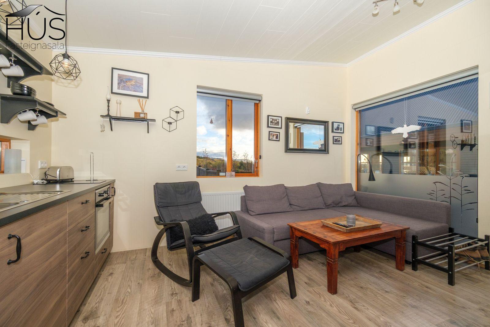 Stofa: Parket á gólfi, opið í eldhús, útgengt á pall