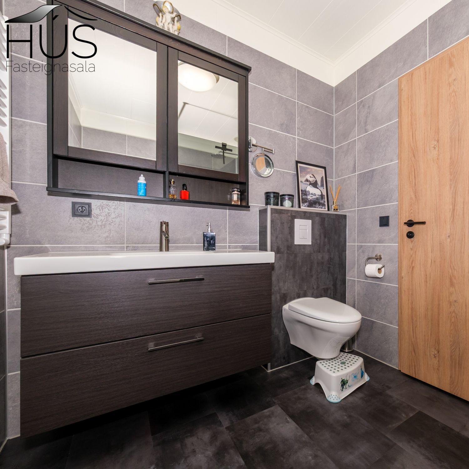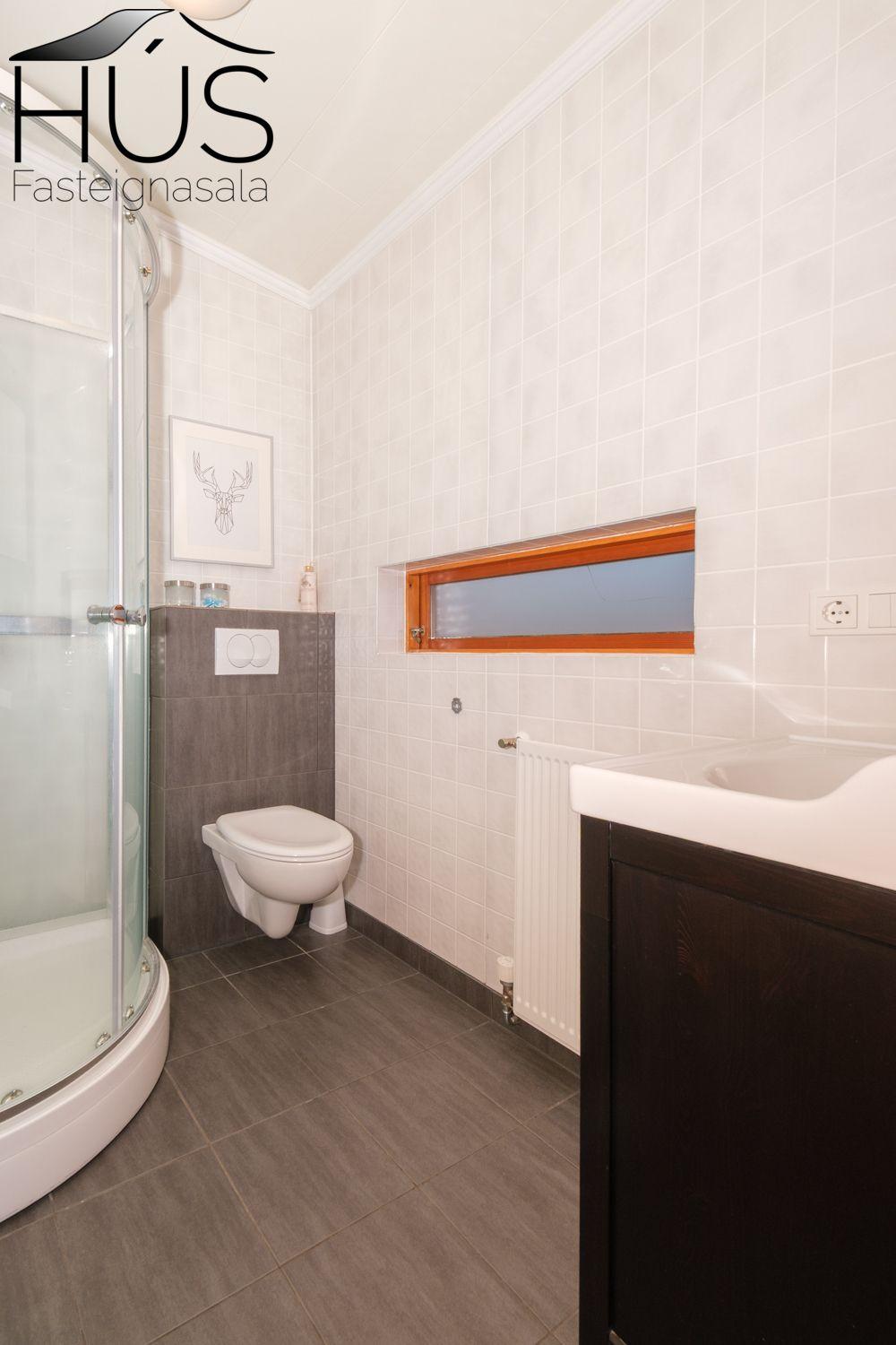 Baðherbergi: Flísar á gólfi og fibo plötur á veggjum, sturtuklefi, innrétting, upphengt wc, handklæðaofn, opnanlegur gluggi.
