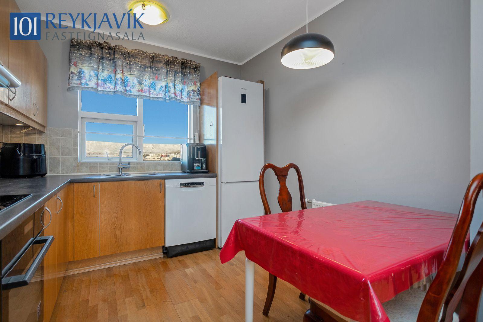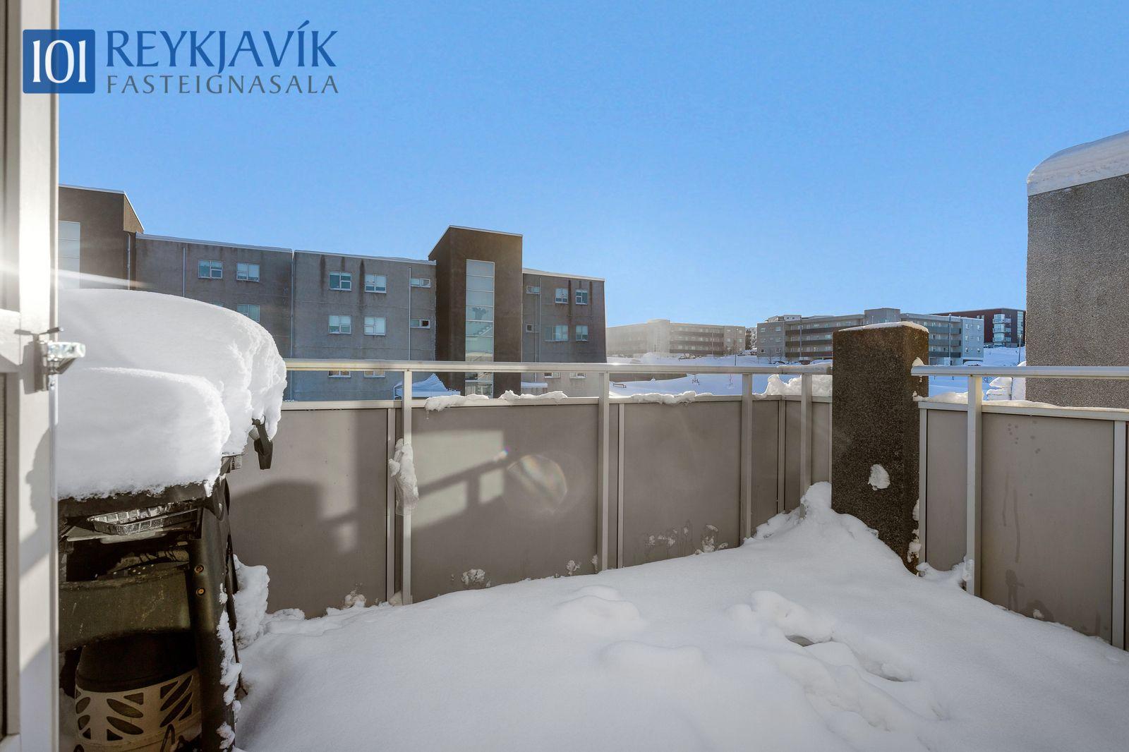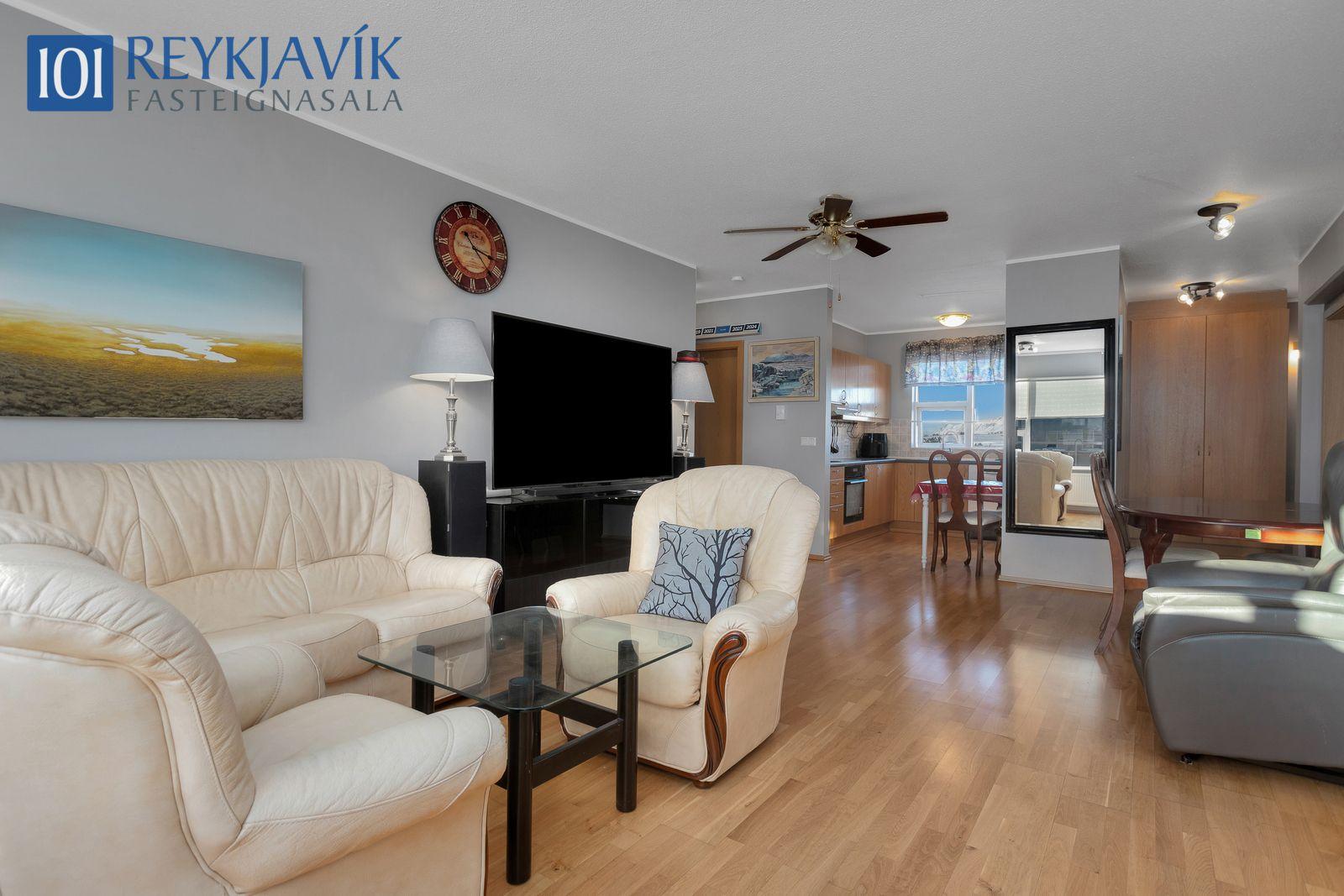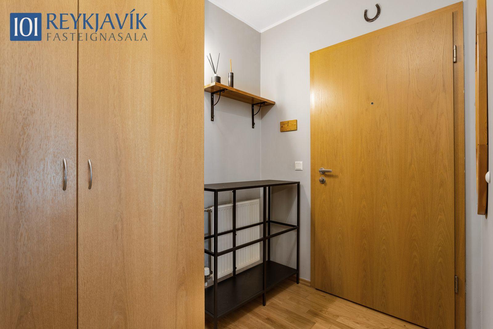 Lýsing eignar: Forstofa parketlögð og með fataskáp. Tvö svefnherbergi parketlögð og með fataskápum, minna herbergið með lausum skáp. Stofa og borðstofa samliggjandi í rúmgóðu parketlögðu björtu rými með útgengi að góðum svölum. Eldhús opið að stofu og borðstofu. Eldhúsinnrétting mjög rúmgóð með efri og neðri skápum og skúffum. Flísalagt er á milli skápa og lýsing. Ofn, helluborð og vifta, pláss í innréttingu fyrir uppþvottavél og frístandandi ísskáp. Þvottahús er í íbúð og þar er tengi fyrir þvottavél og þurrkara. Baðherbergi rúmgott, baðinnrétting með neðri skápum. Efri skápur, spegill og lýsing fyrir ofan. Opin rúmgóð sturta. Flísalagðir veggir og gólf.