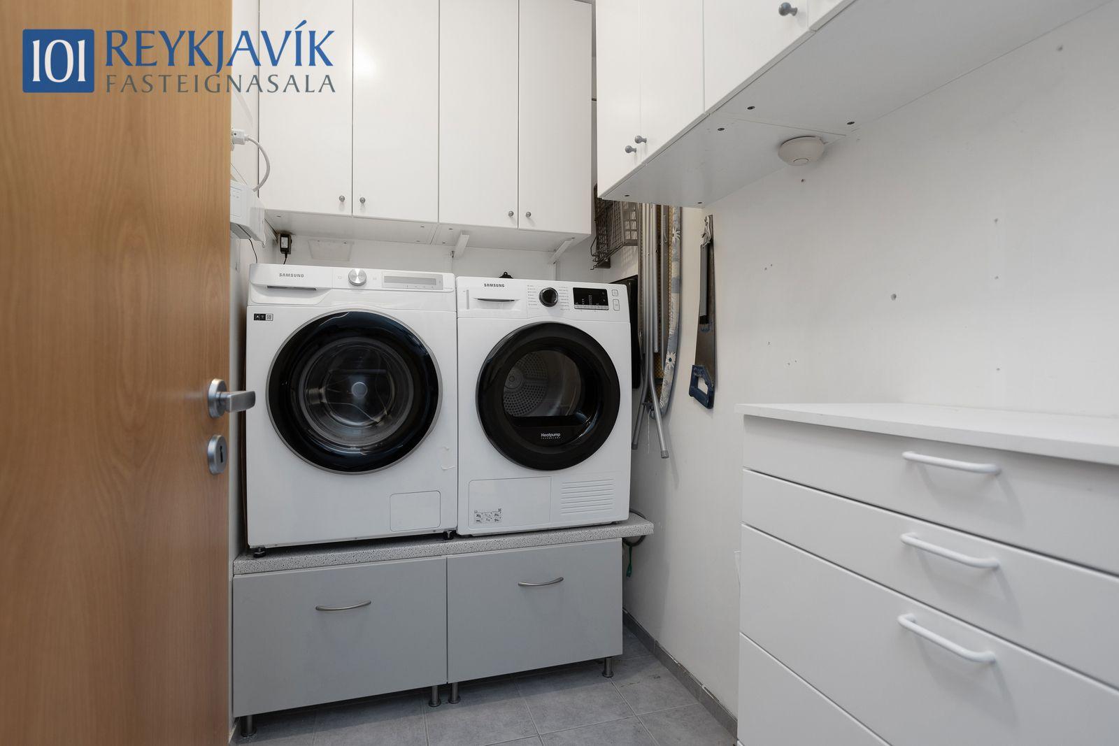 Góð geymsla er á jarðhæð hússins. Sameiginleg hjóla og vagnageymsla á jarðhæð. Sameign snyrtileg, sameiginleg lóð.
