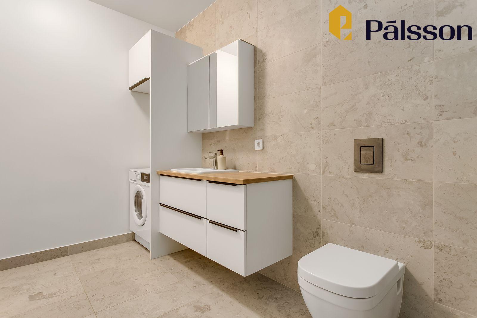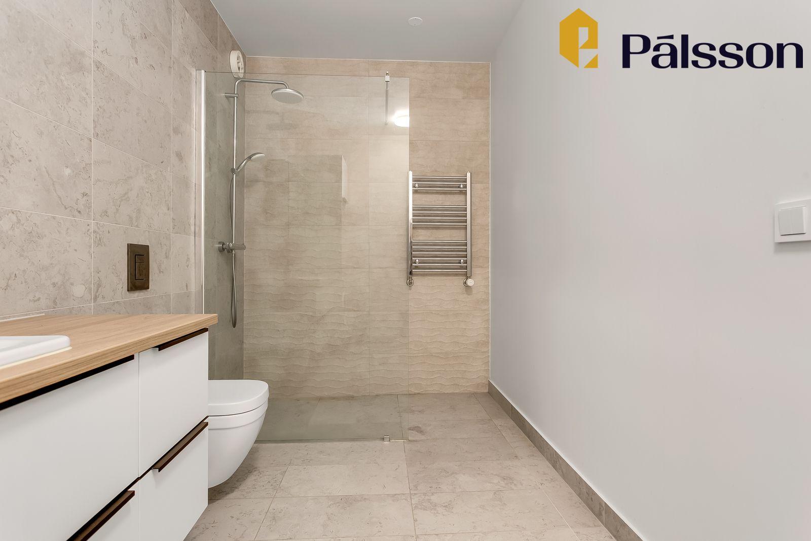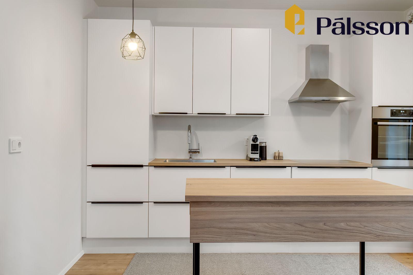Eldhús er opið inn í rúmgóða stofu og borðstofu.Baðherbergið er rúmgott og með sturtu, fallegri innréttingu og tengi fyrir þvottavél og þurrkara en án glugga.