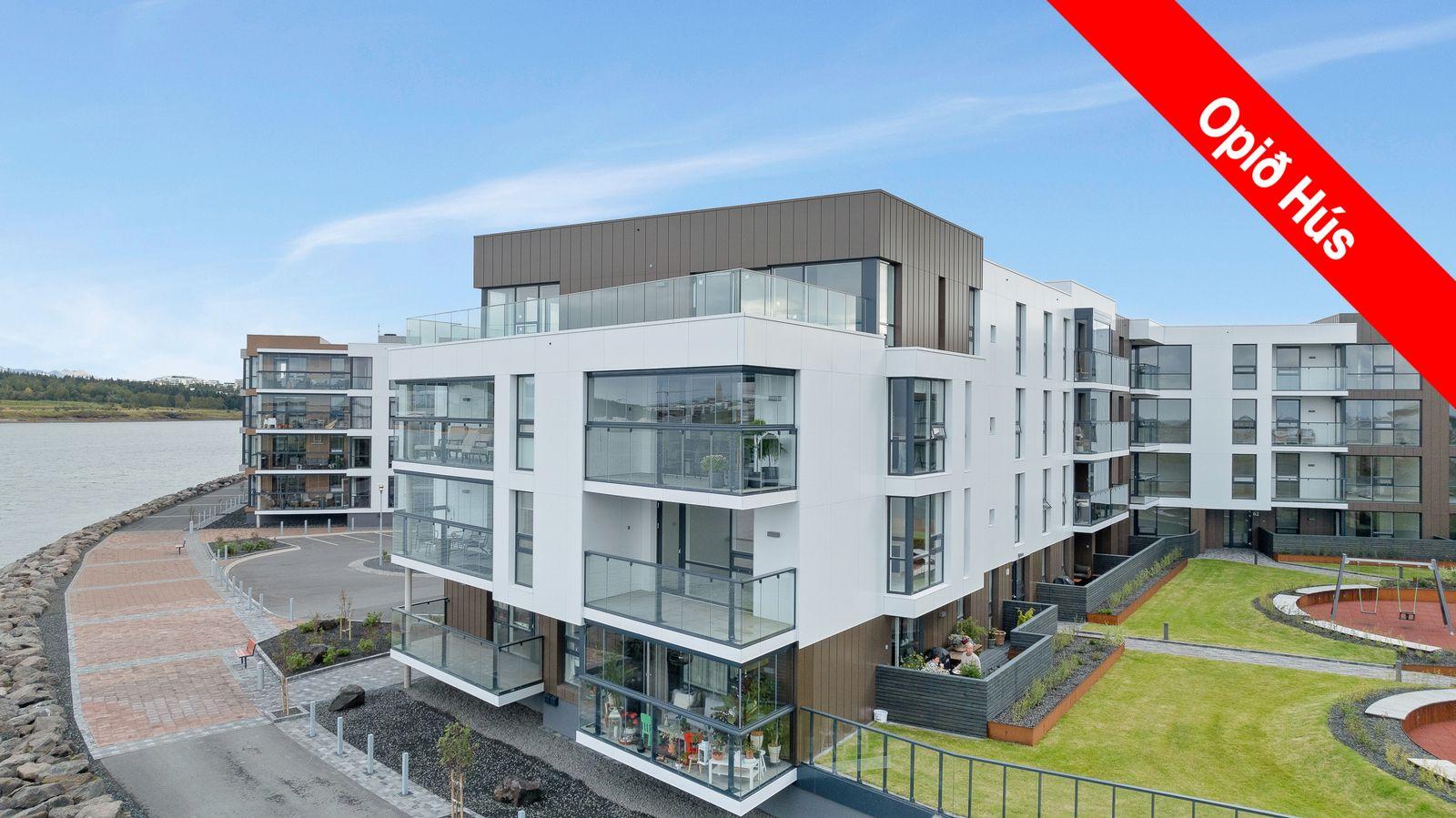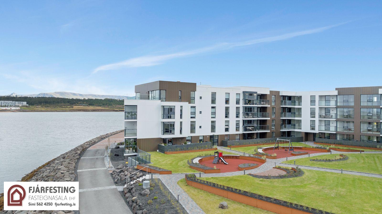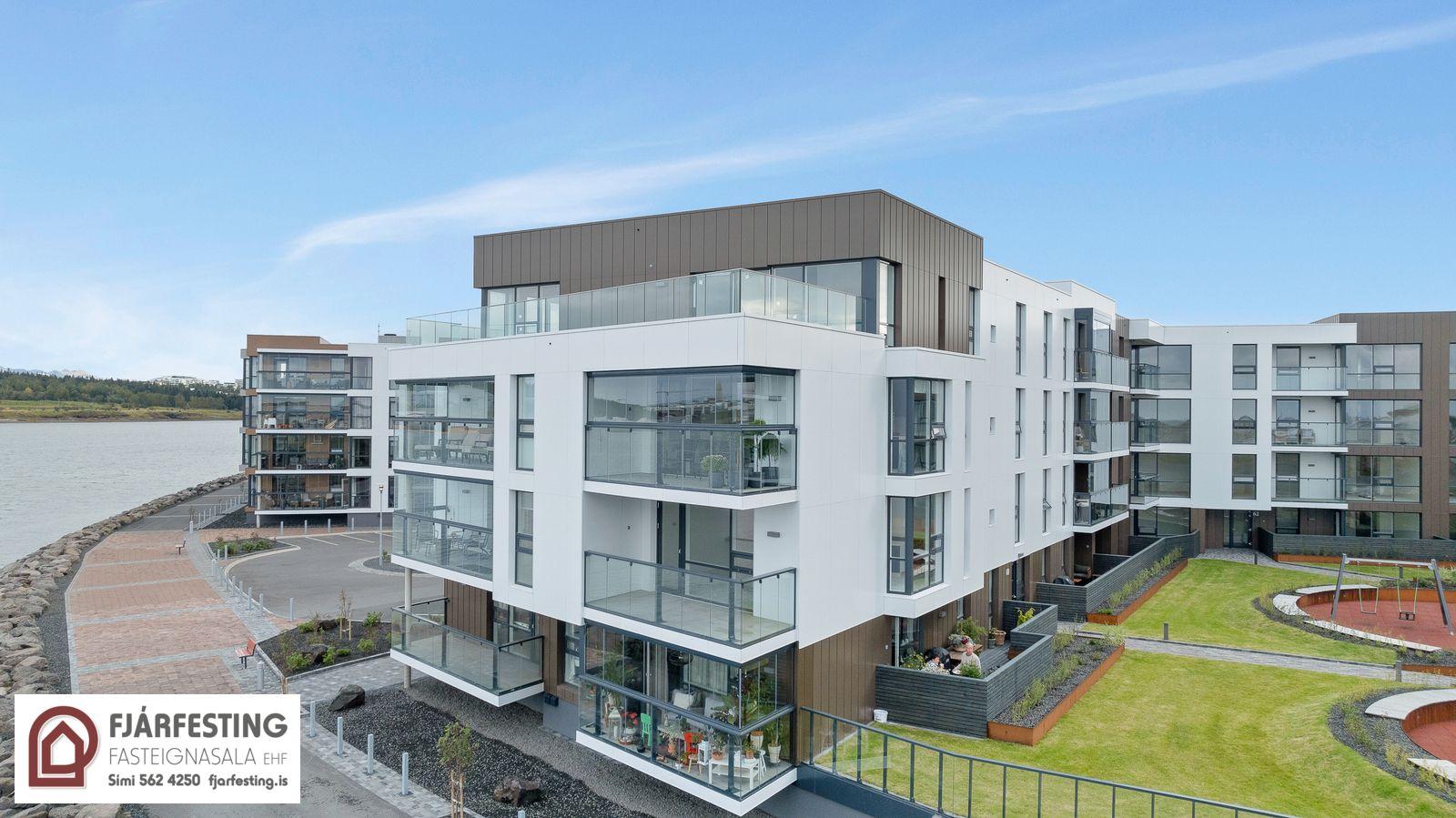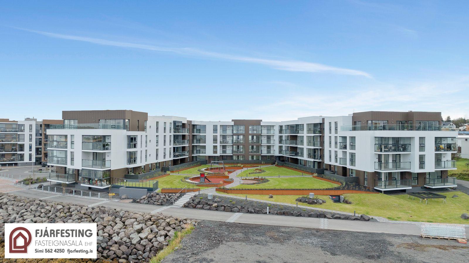 Glæsileg og vel skipulögð 3ja herbergja íbúð á 2. hæð, merkt 213 í fallegu nýju álklæddu lyftuhúsi. Íbúðin er afhent án gólfefna. Íbúðin sjálf er 104 fm. Sérgeymsla í kjallara er 8,2. fm. Samtals er eignin því skráð 112,2 fm. Auk stæði í lokaðri bílgeymslu. Sjávarútsýni. Stæði í lokaðri bílageymslu fylgir. Áætlaður afhendingartími : íbúðin er laus til afhendingar