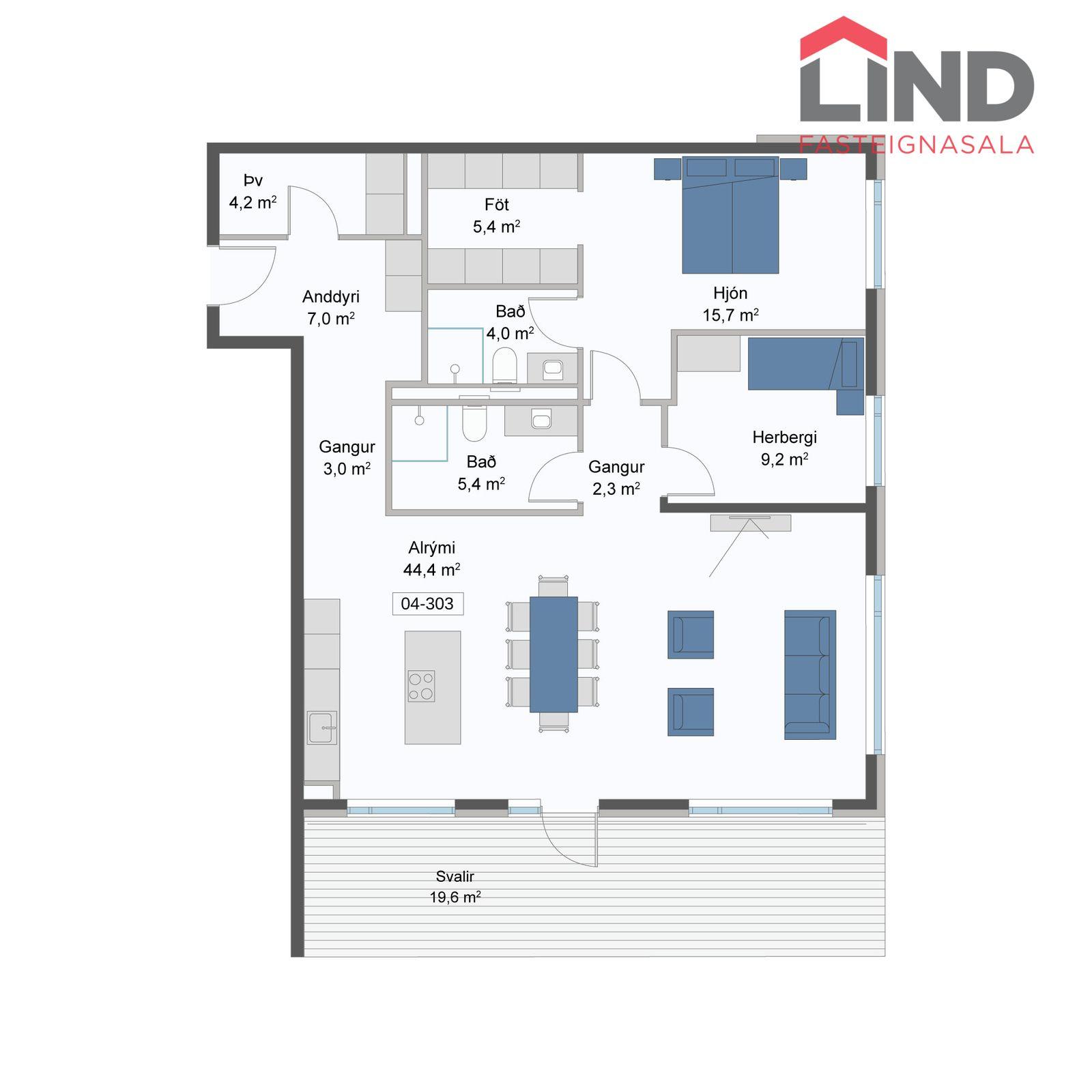 Íbúð 303: Er glæsileg 131,4 fermetra þriggja herbergja íbúð á 3. hæð með stórum 19,6 fermetra svölum til suðurs, tveimur baðherbergjum, fataherbergi og þvottaherbergi. Rúmgóð geymsla fylgir íbúðinni sem er 16,0 fermetrar að stærð auk bílastæðis í bílakjallara. Afhending er í febrúar eða mars 2026 með fyrirvara um að öryggisúttekt sé komin á húsið.
