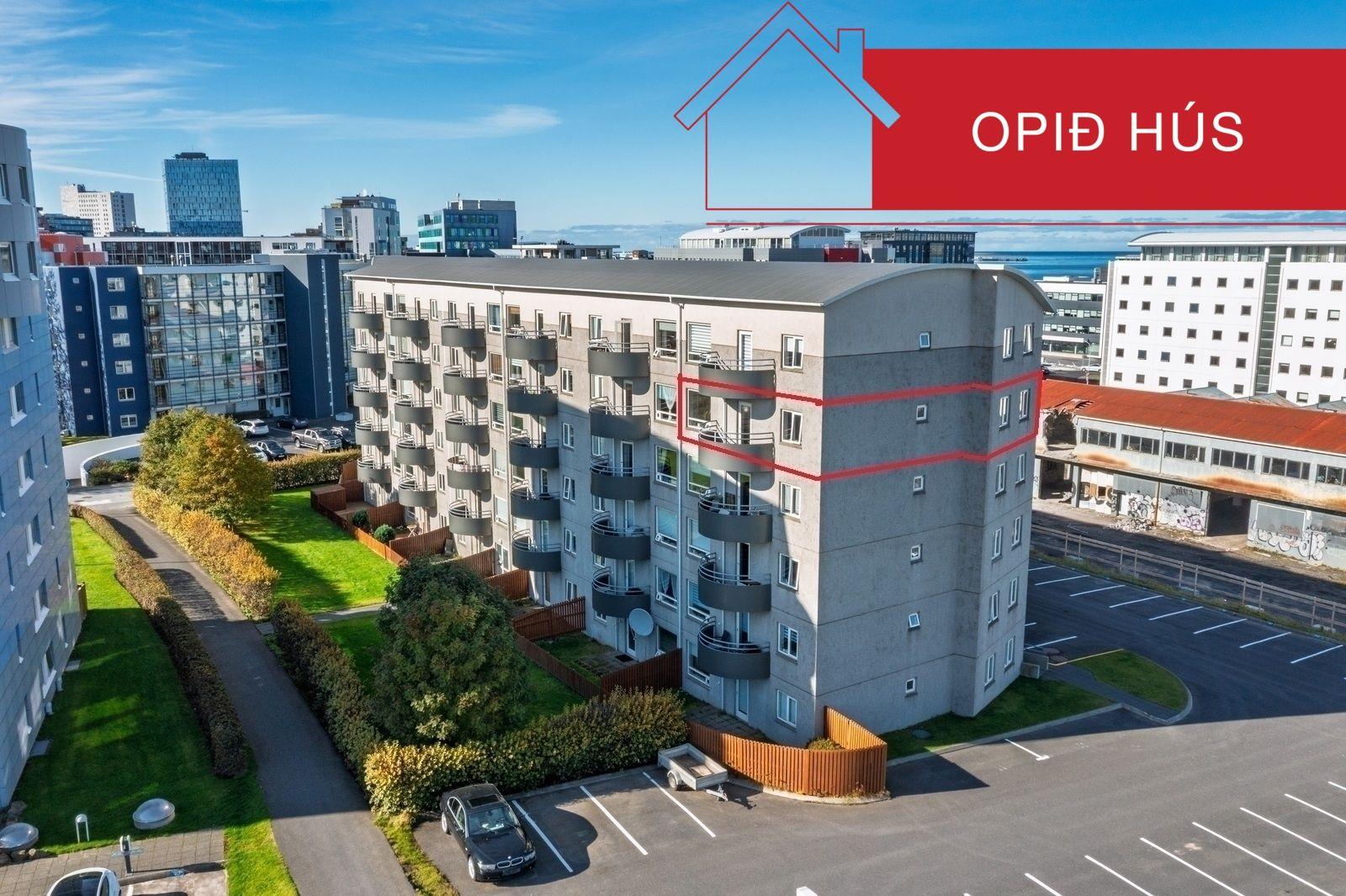 Bílastæði: Sérmerkt bílastæði merkt íbúðinni fyrir framan húsið, og fullt af gestastæðum.