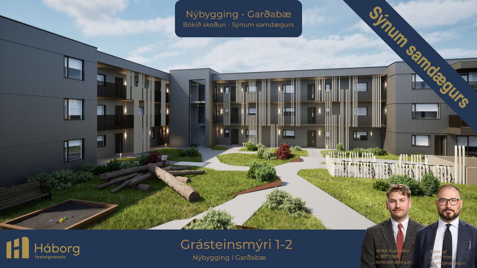 Háborg fasteignasala kynnir Grásteinsmýri 1, Garðabæ. Nýbyggingin er staðsteypt, einangruð að utan og klædd með ál- og bambus klæðningu. Góðar 2ja, 3ja 4ra og 5 herbergja íbúðir í litlu fjölbýli með lyftu. Útsýni er úr flestum íbúðum og timbur-verönd fylgir íbúðum á 1. hæð. Íbúðirnar afhendast án megin gólfefna en baðherbergi eru flísalögð að hluta. Næg bílastæði á lóð. Áætluð afhending íbúða er í mars-apríl 2026.Sölusíða GrásteinsmýriNýr valkostur í fjármögnun. Kaupendur geta nýtt sér nýjan sjóð Öxar 20 sem styður þá með því að fjárfesta með þeim allt að 20% af kaupverði. Kynntu þér málið hér Öxar.isNánari lýsing á íbúð 208 3ja herbergja: Stærð 94,5 fm. Sérinngangur af svölum. Þegar komið er í forstofu eru góðir fataskápar. Barnaherbergi er bjart með góðum fataskápum. Hjónaherbergi er einnig rúmgott og bjart með góðum fataskápum. Baðherbergi er með góðri snyrtiaðstöðu. Sér þvotthús innaf eldhúsi með góðri vinnuaðstöðu. Alrými er mjög rúmgott og bjart með opið eldhús með eyju sem hægt er að sitja við. Stofur eru rúmgóðar og bjartar. Úr alrými og stofu er útgengt á svalir 6,5 fm að stærð. Eigninni fylgir stæði í bílakjallara merkt B17 og geymsla að stærð 4,7 fm.