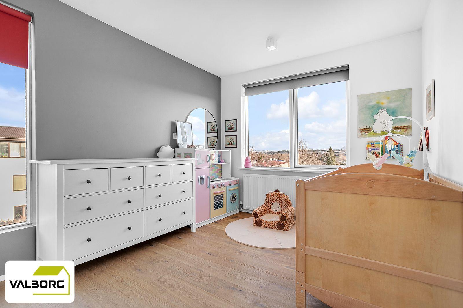 Svefnherbergin: Eru þrjú, tvö á neðri hæð, öll rúmgóð. Útgengi á svalir frá einu þeirra til vesturs.