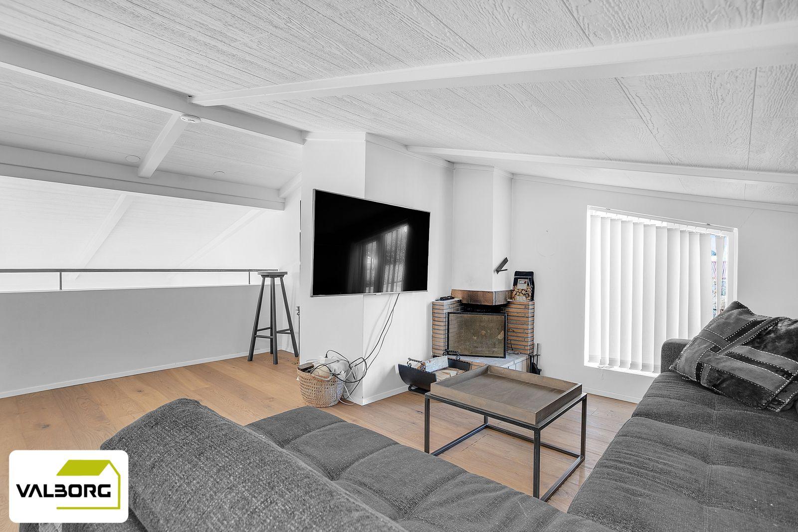 Arinstofa/sjónvarpsrými: Er að hluta til undir súð með fallegum arni. Af efri hæð er horft niður í stofu og borðstofu.