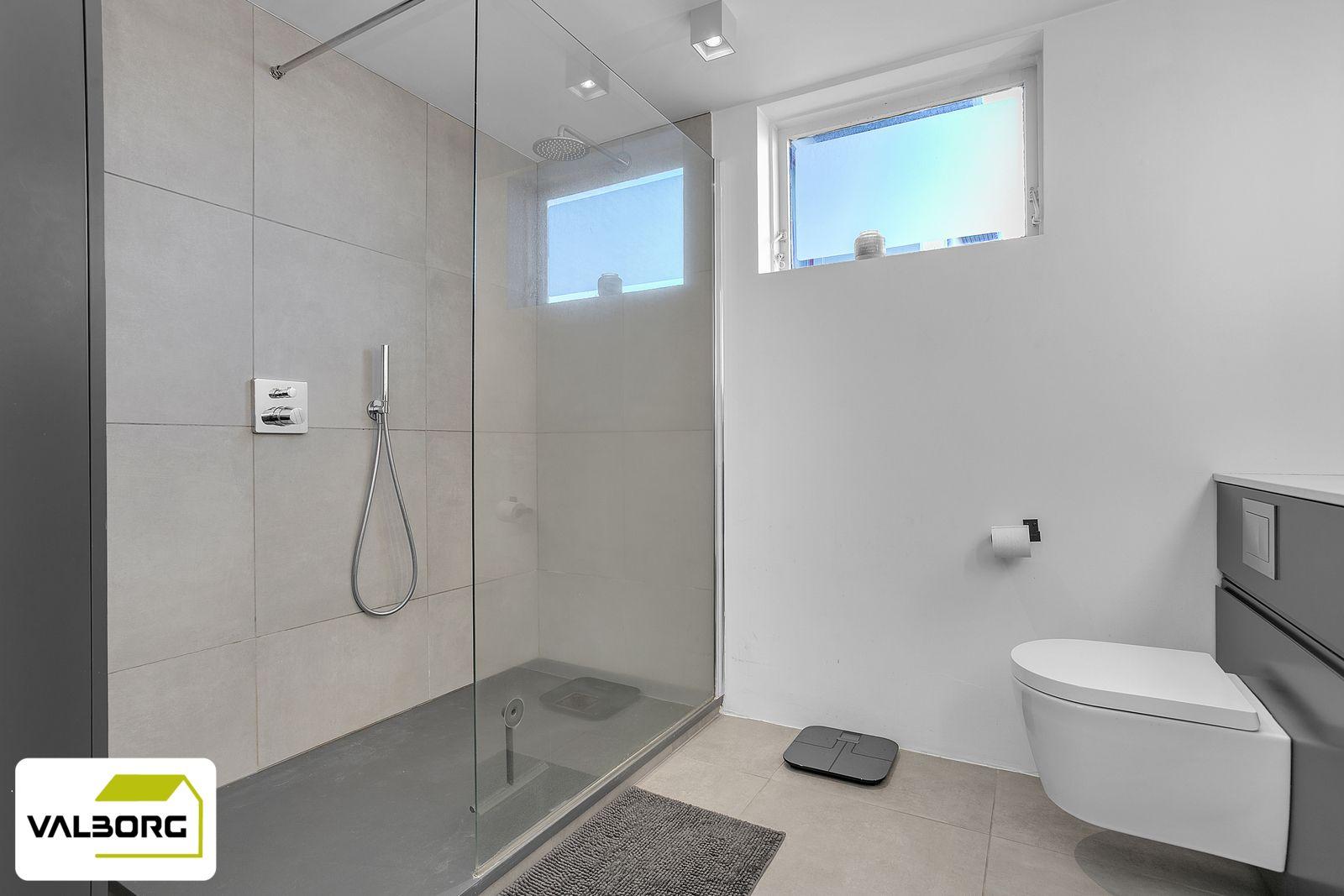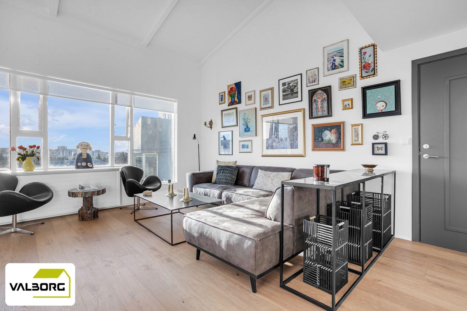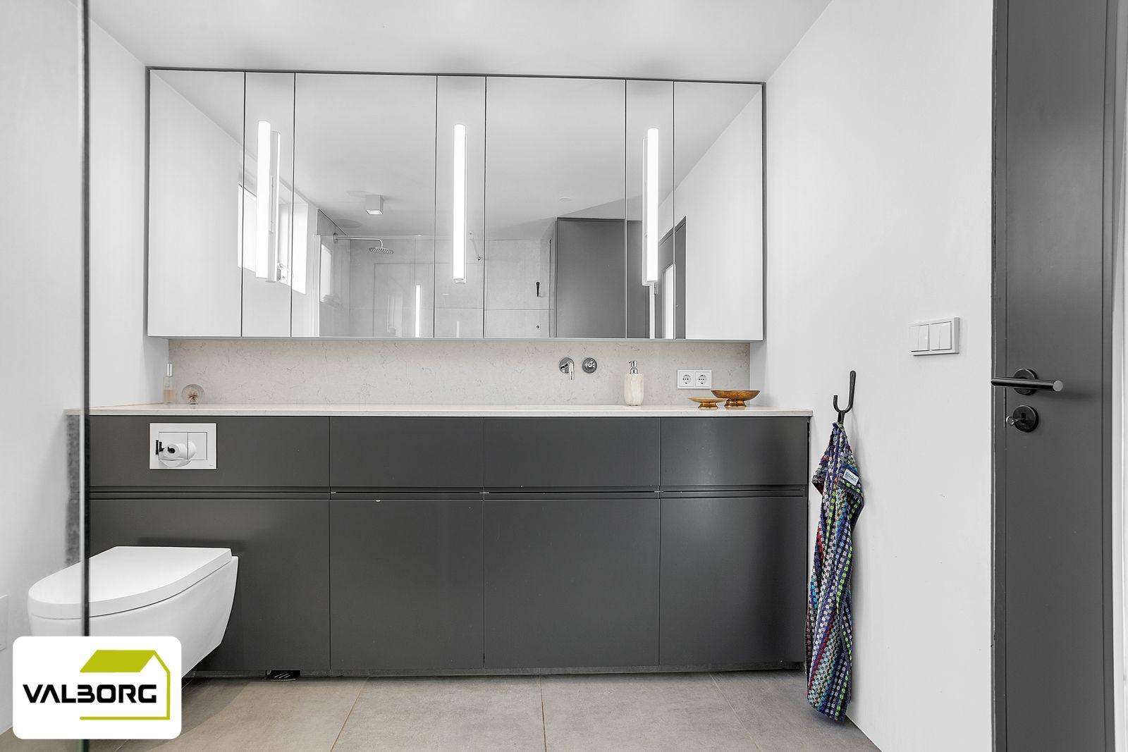 Baðherbergið: Var stækkað og endurhannað með rúmri sérsmíðaðri innréttingu og efri skápum með lýsingu frá Lumex. Handlaug í stein borðplötu frá Rein, innbyggð sturta, upphengt salerni og gólfhiti. Flísar frá VÍDD eru á gólfi og við sturtu. Sérsmíðuð aðstaða fyrir þvottavél og þurrkara inn á baðherbergi.