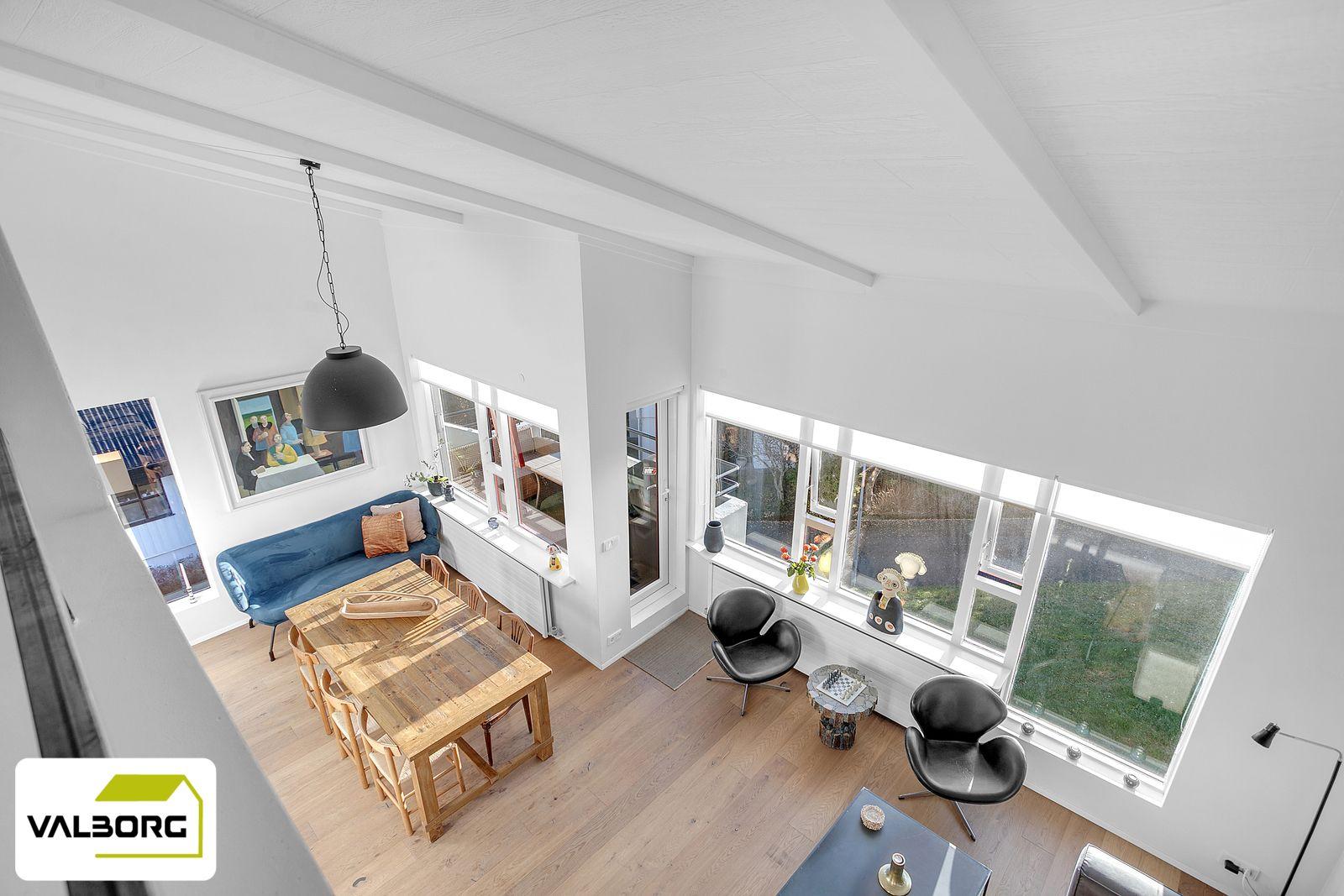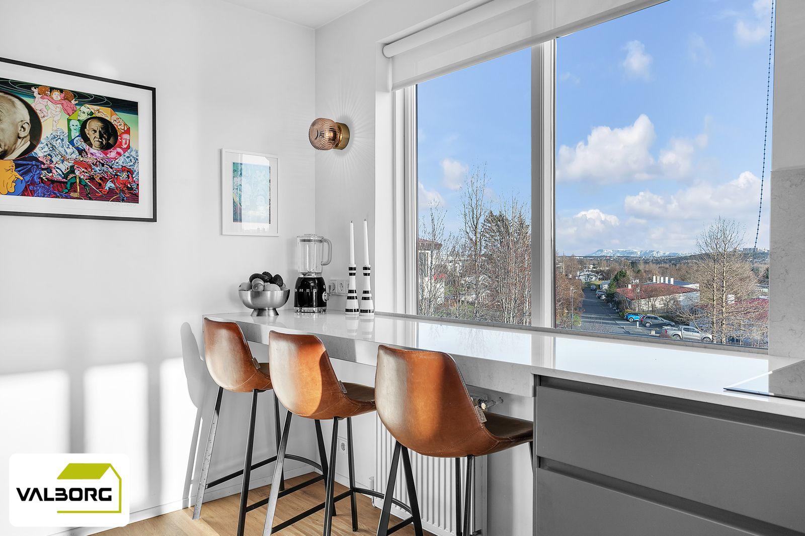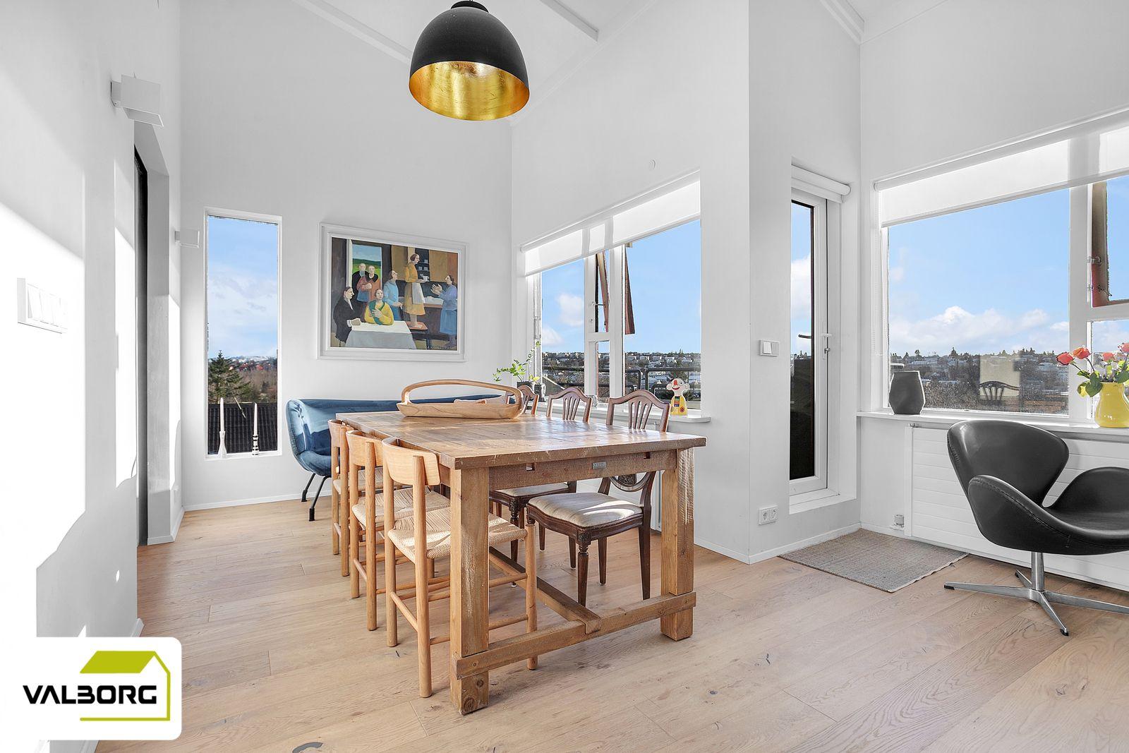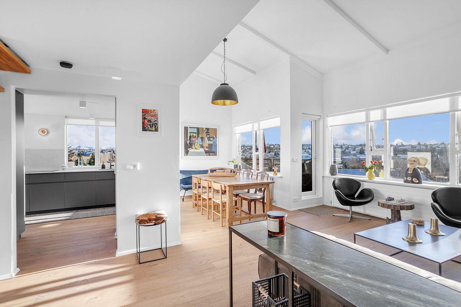 Stofan og borðstofan: Eitt rými, björt og opin inn í eldhús að hluta. Aukin lofthæð sem gerir rýmið einstaklega fallegt með útsýni til suðurs. Gengið er út á suðursvalir frá stofu. Einstakt útsýni.