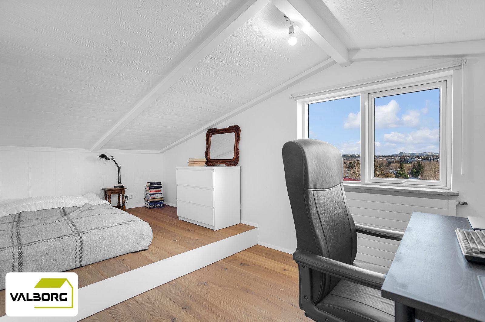 Rúmgott svefnherbergi eða vinnuherbergi undir súð með fallegu útsýni.