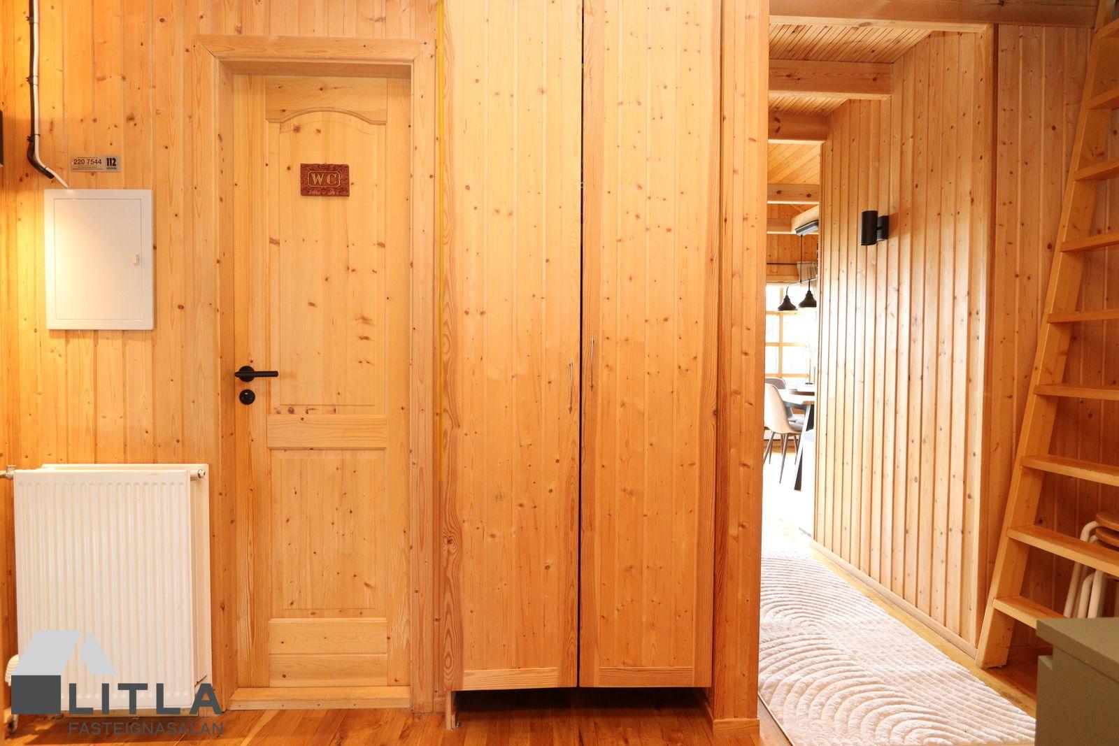 Hjónaherbergi með fataskáp og hurð út við heitan pott