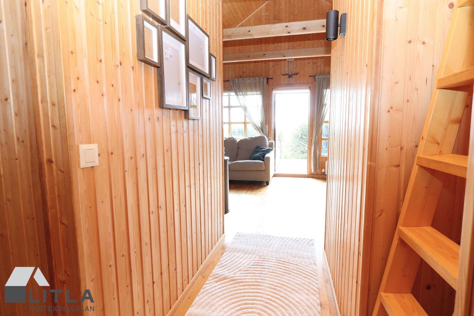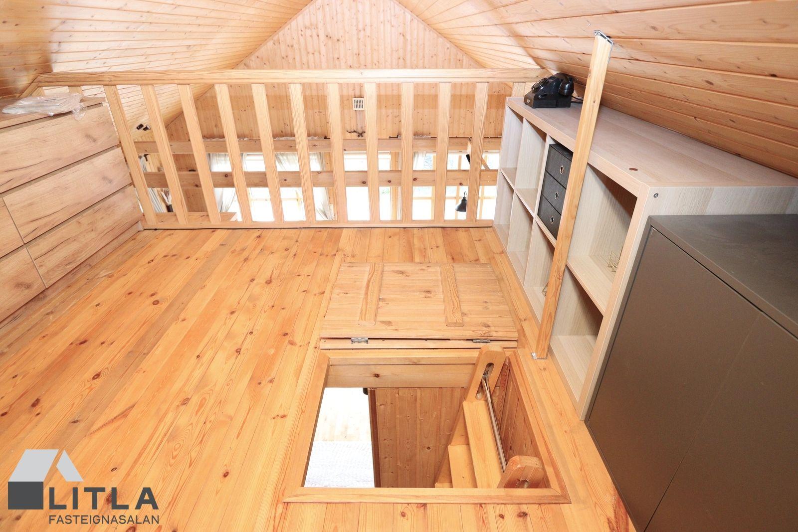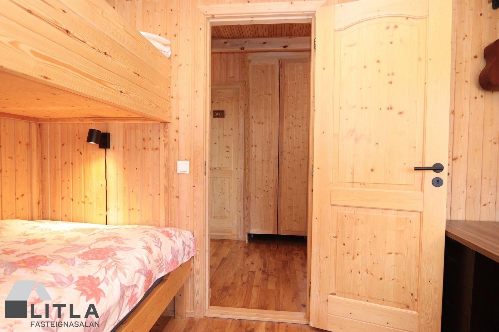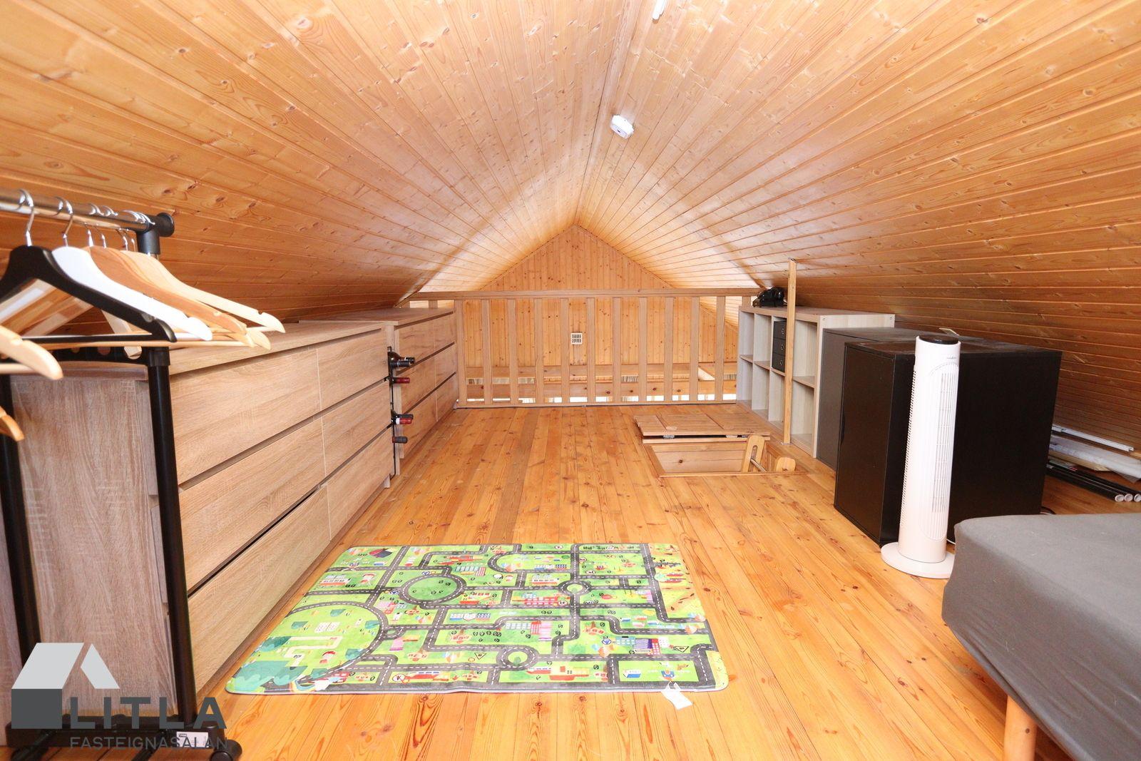 Svefnloft er nokkuð rúmgott stiga upp af gangi og með hlera, opið niður í alrými