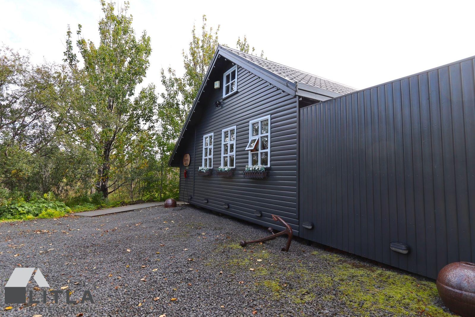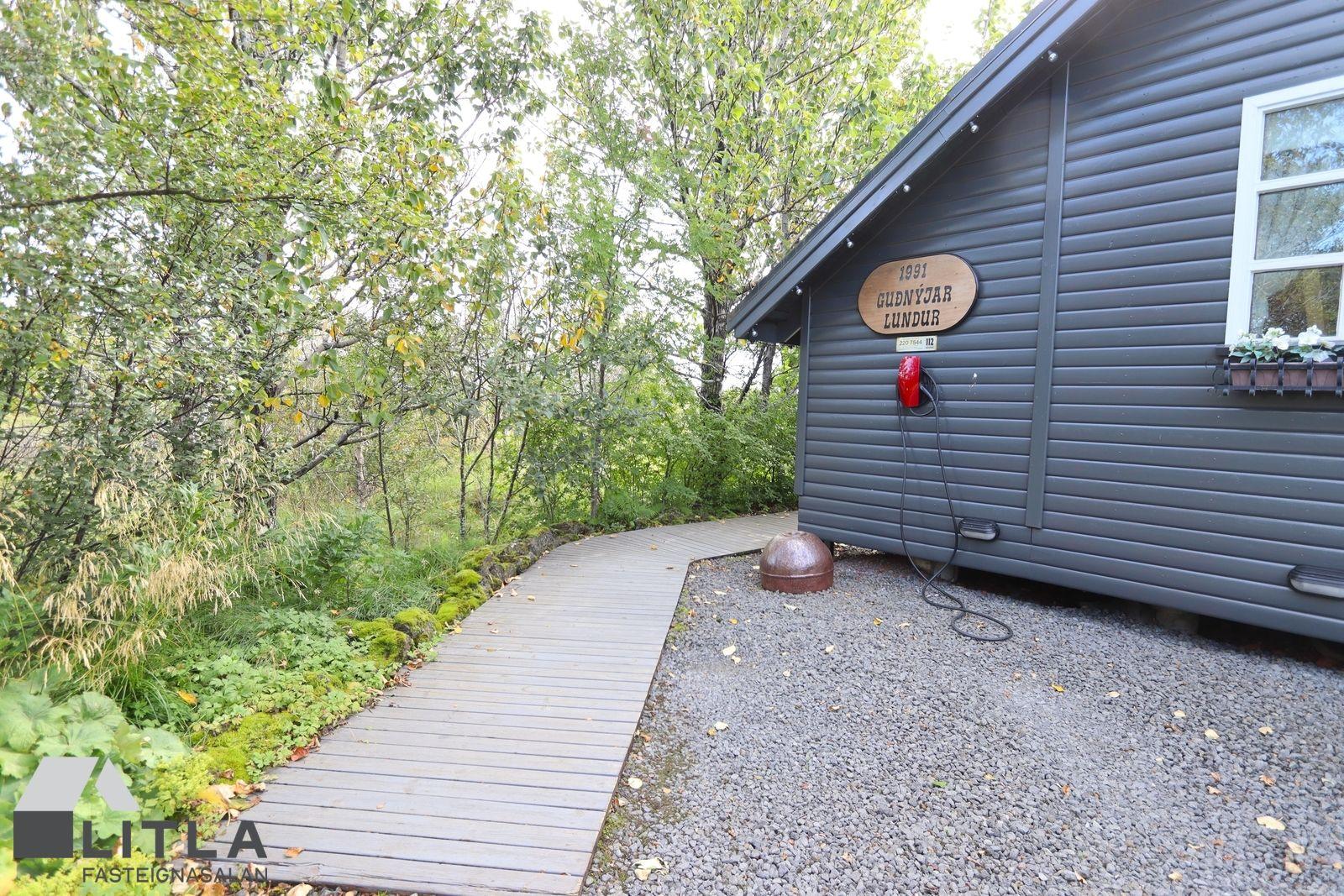 Hleðslustöð fylgir, gott malarlagt plan og innkeyrsla
