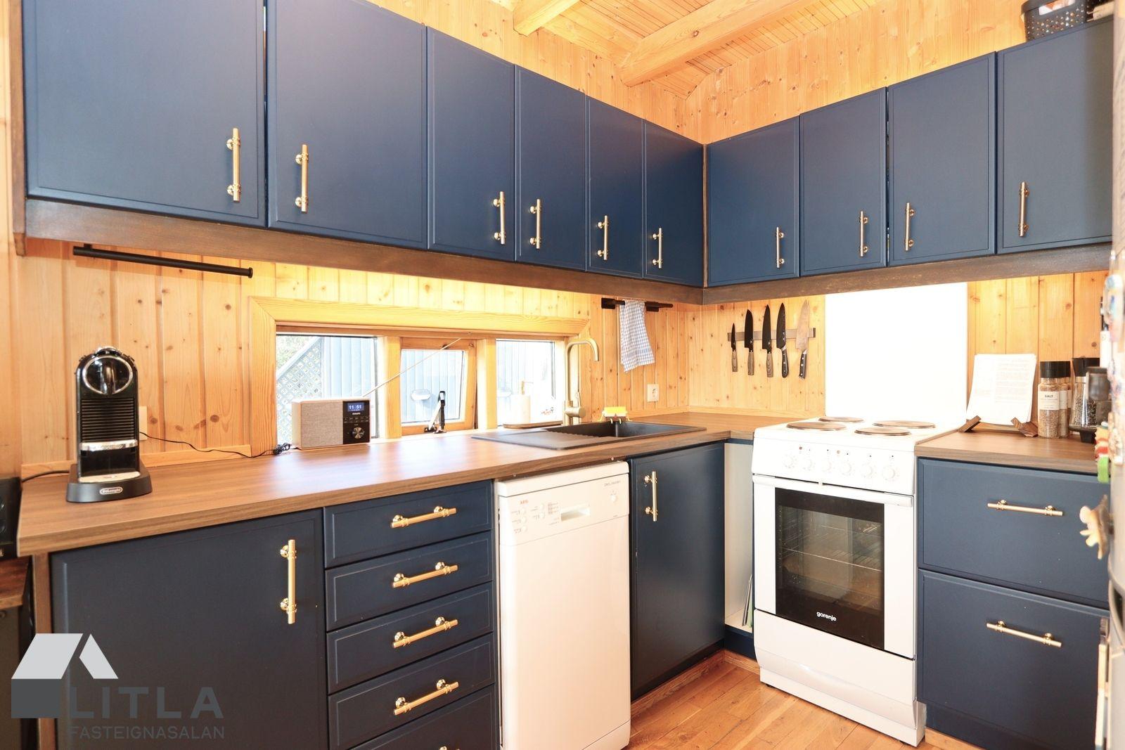 Eldhús með blárri /viðarinnréttingu, með nýjum vaski og blöndunartækjum, eldavél og tengi fyrir uppvöskunarvél
