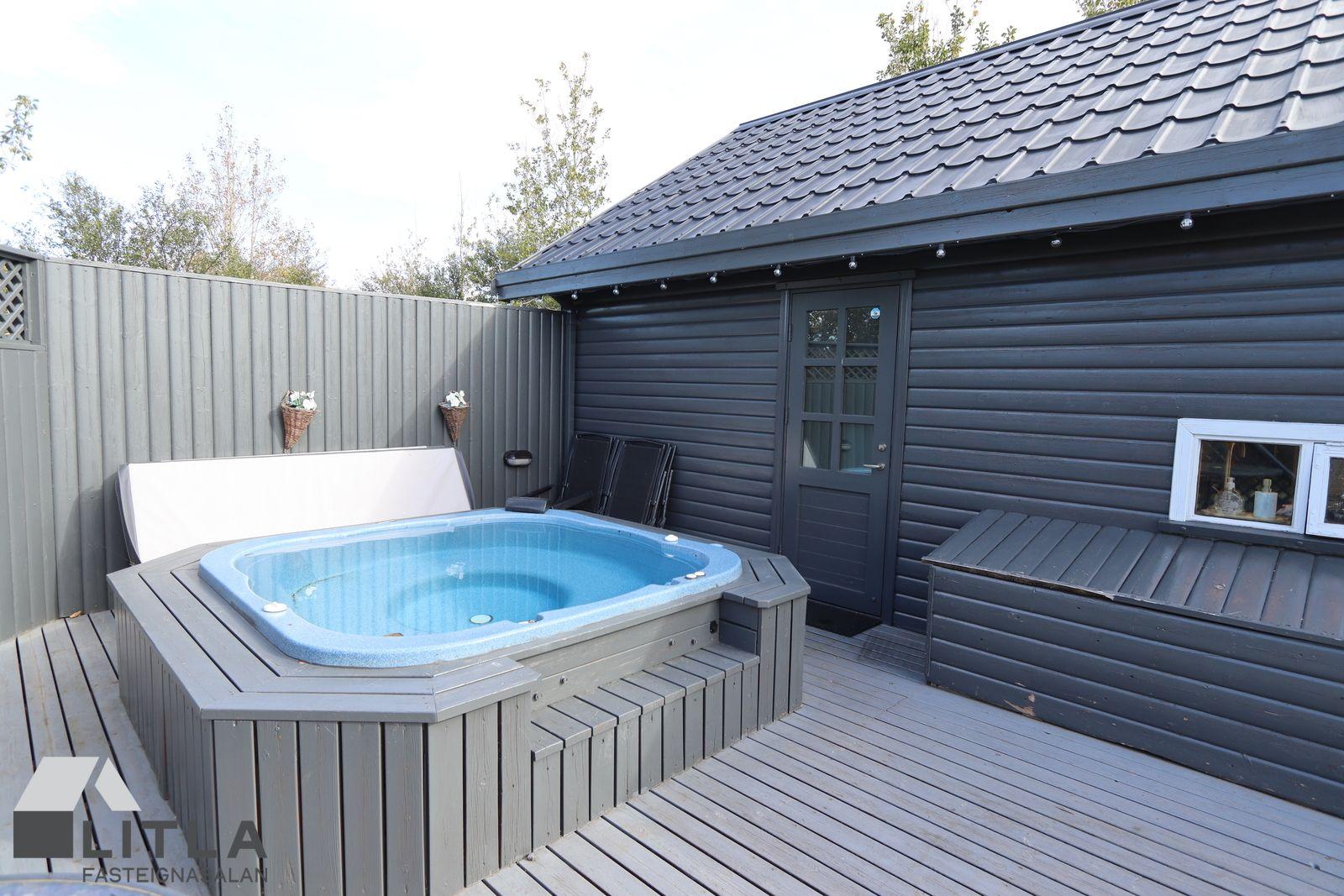 Pallur er umhverfis 3 hliðar hússins, á lóð eru leiktæki mark og kofi.