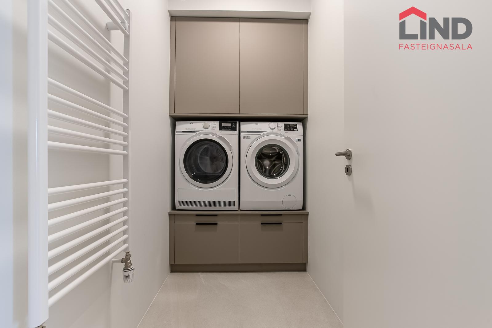Þvottahús: Sér þvottahús með innréttingu frá Selós, beige og grábrún að lit, undir þvottavél og þurrkara. Vélrænt loftræstikerfi er í öllum íbúðum, og loftræstisamstæða er staðsett í þvottahúsinu.