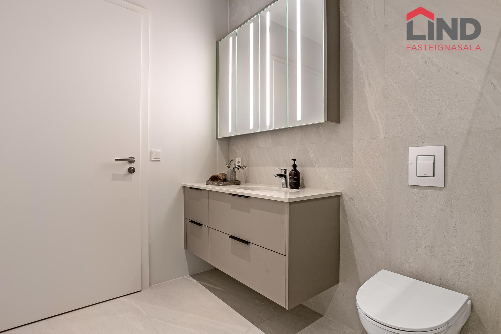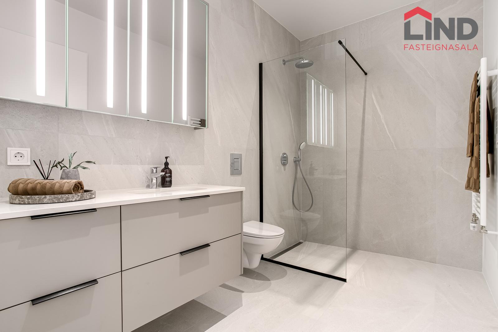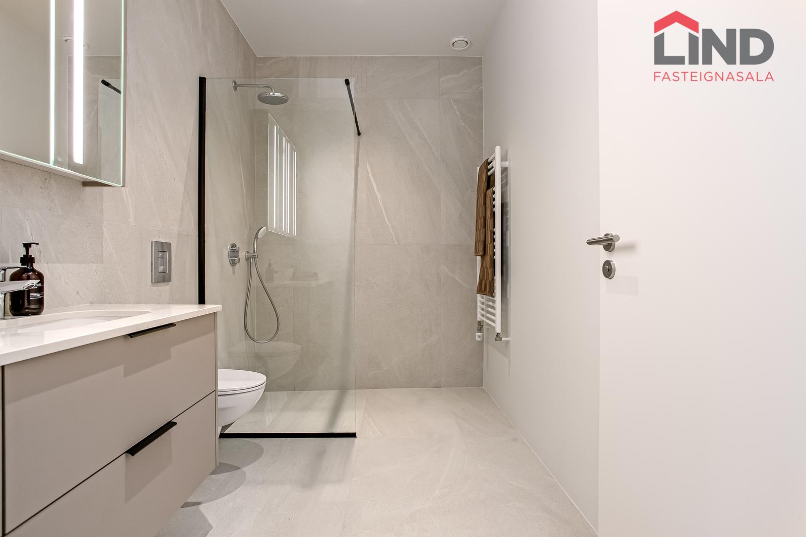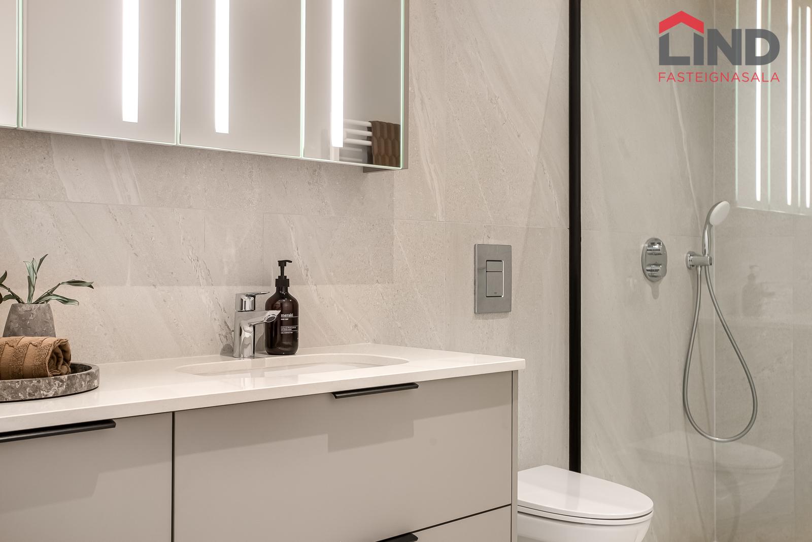 Baðherbergi: Gráar flísar 60x120 að stærð á gólfi og á veggjum að hluta. Borðplötur eru úr 20mm Quartz steini með undirlímdum vaski. innréttingin er frá Selós, framhliðar eru matt beige, grábrúnar að lit. Upphengt salerni, handklæðaofn og sturta. Hreinlætistæki eru frá Grohe og innihalda hitastýrð og innbyggð blöndunartæki í sturtu.