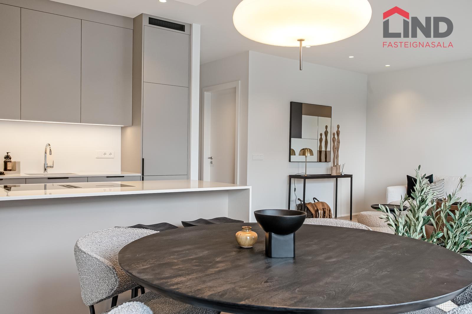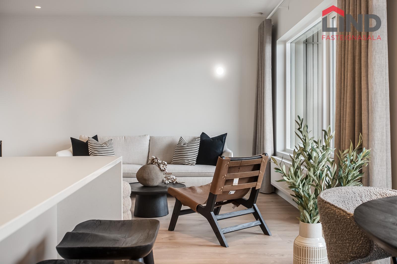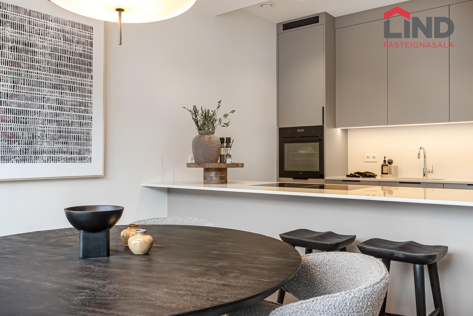 Eldhús: Parket á gólfi, gott skápa- og borðpláss. Innréttingin er frá Selós, með matt beige og grábrúnar framhliðar. Borðplötur eru úr 20 mm Quartz-steini með undirlímdum vaski úr stáli. Eldhústæki eru frá AEG. Innbyggður ísskápur, frystir og uppþvottavél fylgja. Skúffur eru með mjúklokunarbúnaði og LED-lýsing er undir efri skápum. Höldur eru svartar griphöldur frá Selós.