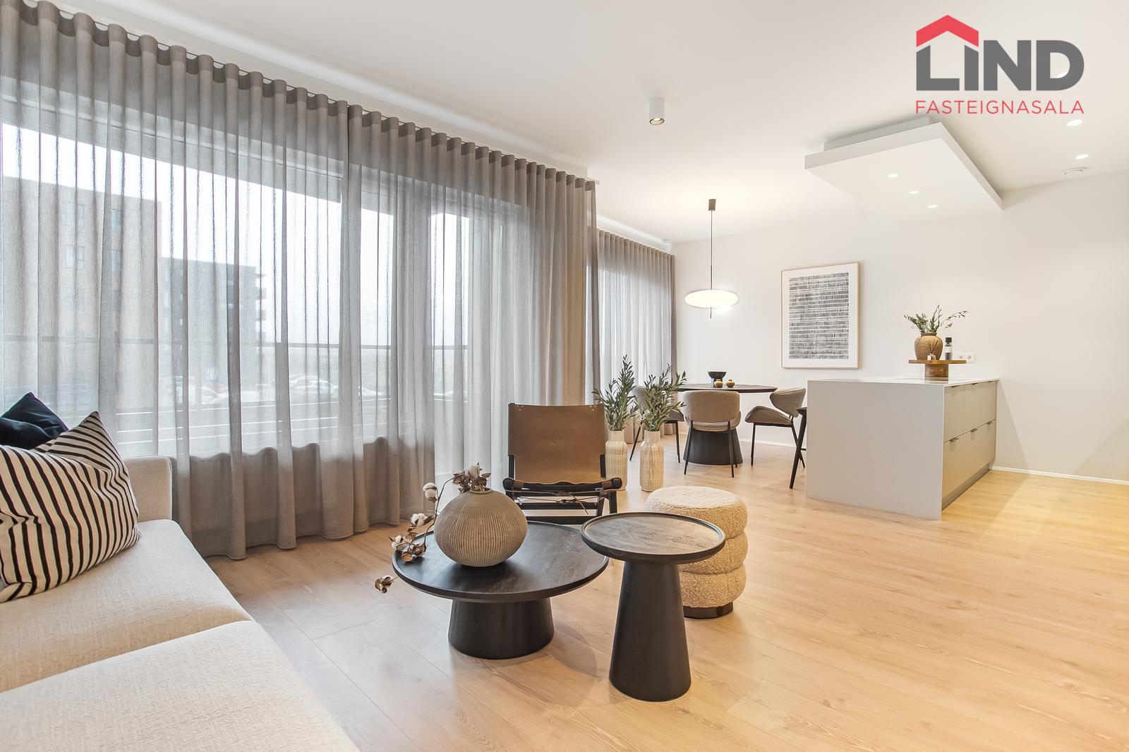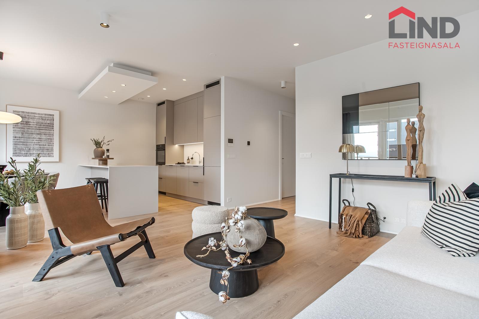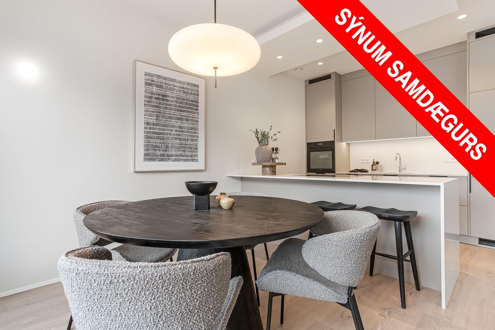Eldhús: Parket á gólfi, gott skápa- og borðpláss. Innréttingin er frá Selós, með matt beige og grábrúnar framhliðar. Borðplötur eru úr 20 mm Quartz-steini með undirlímdum vaski úr stáli. Eldhústæki eru frá AEG. Innbyggður ísskápur, frystir og uppþvottavél fylgja. Skúffur eru með mjúklokunarbúnaði og LED-lýsing er undir efri skápum. Höldur eru svartar griphöldur frá Selós.