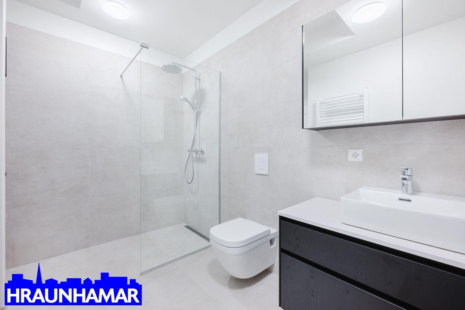 Flísalagt baðherbergi með innréttingu, upphengdu salerni og sturta