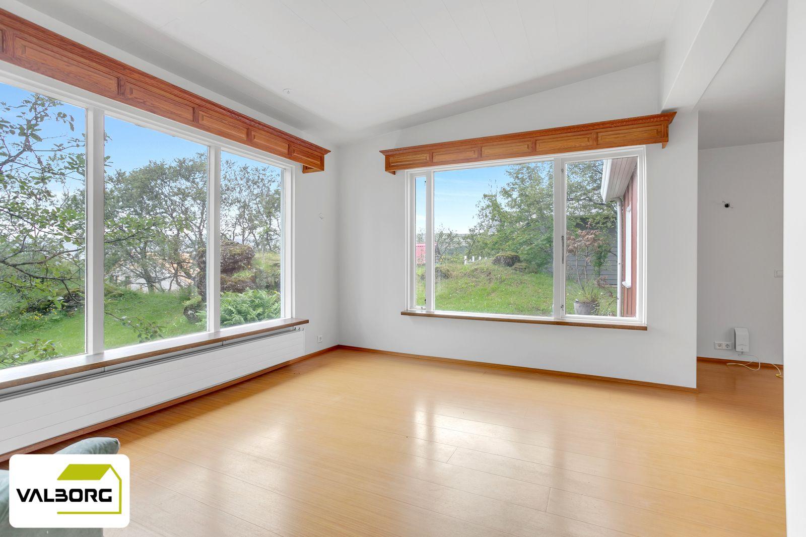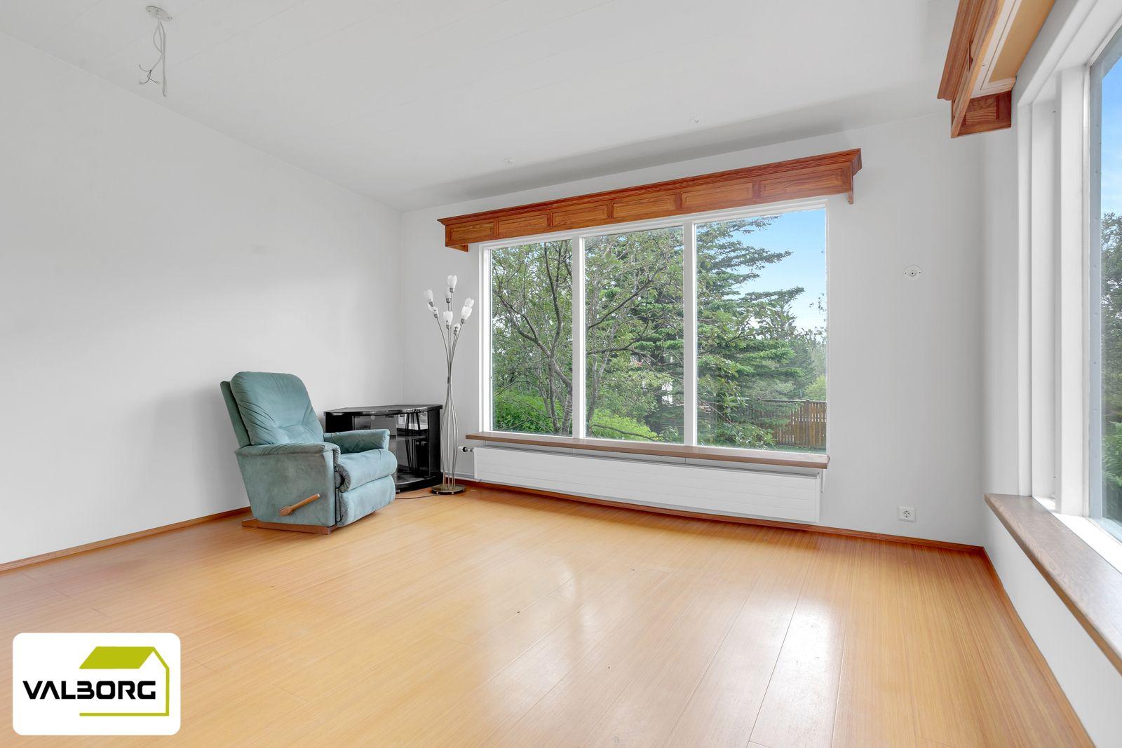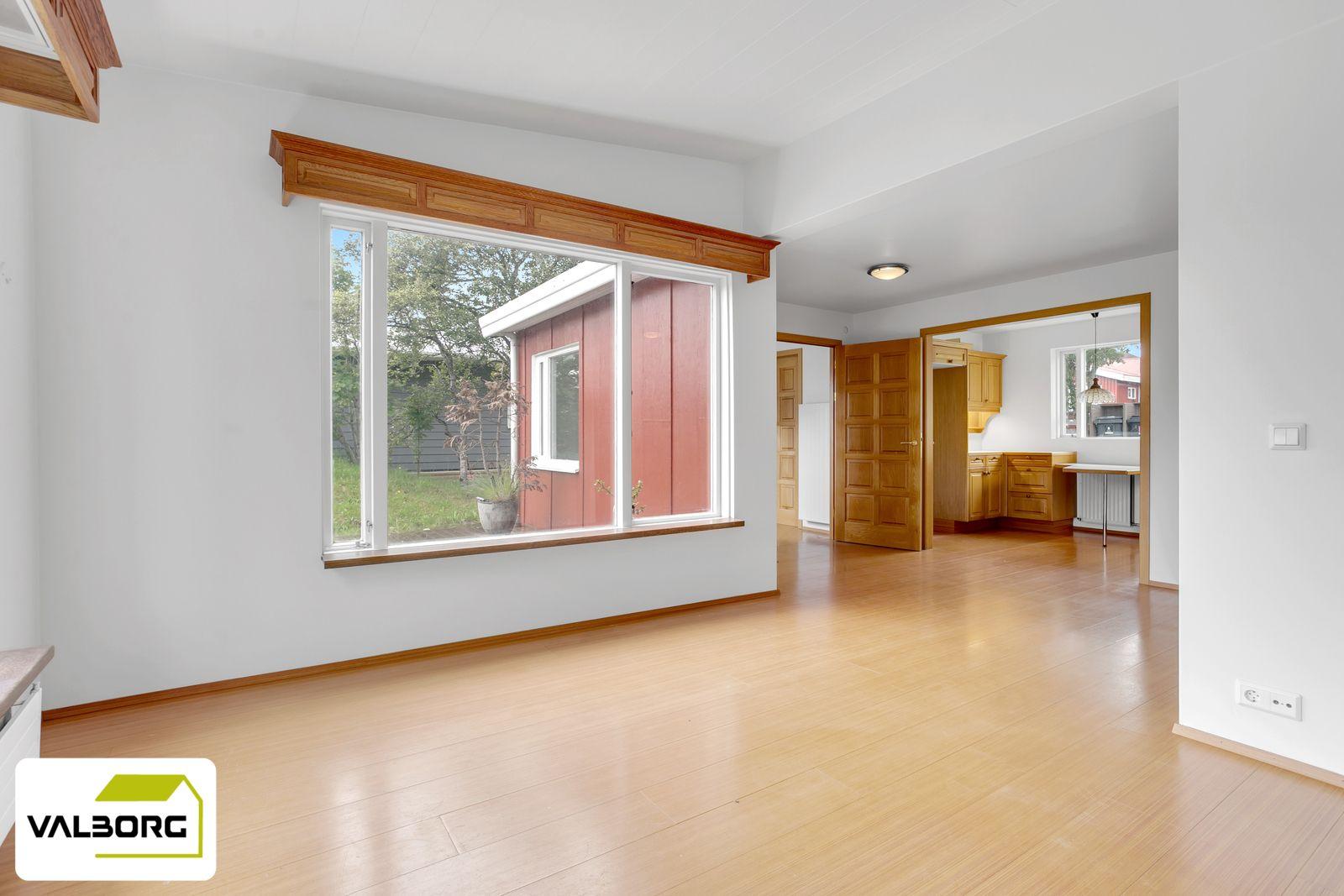 Stofan er björt með stórum gluggum er snúa út á baklóð, parket á gólfi.