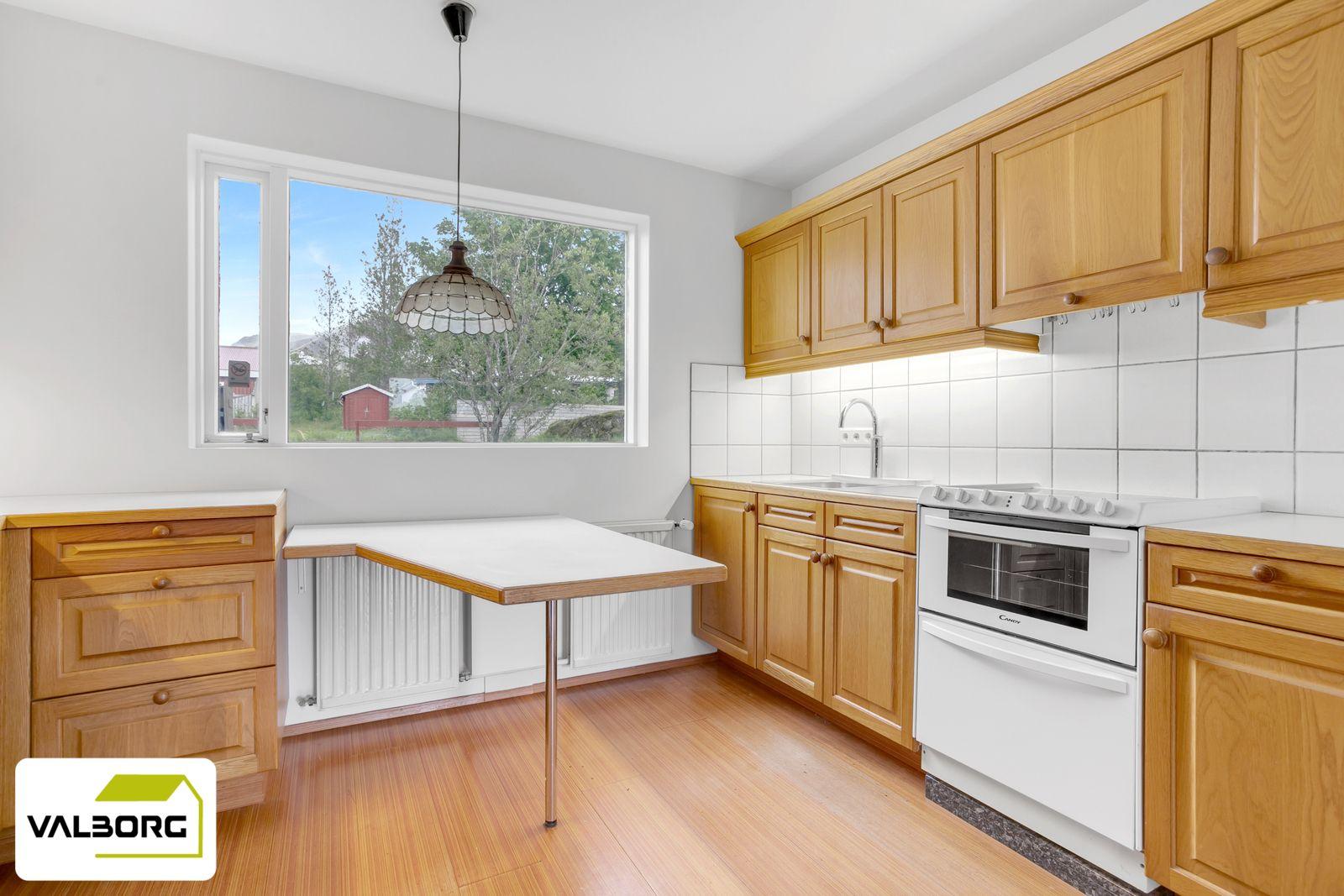 Eldhús að hluta opið inn í alrými og stofu. Viðarinnrétting með skápa og skúffuplássi. Helluborð, bakarofn og gert ráð fyrir ísskáp í innréttingu, parket á gólfi.