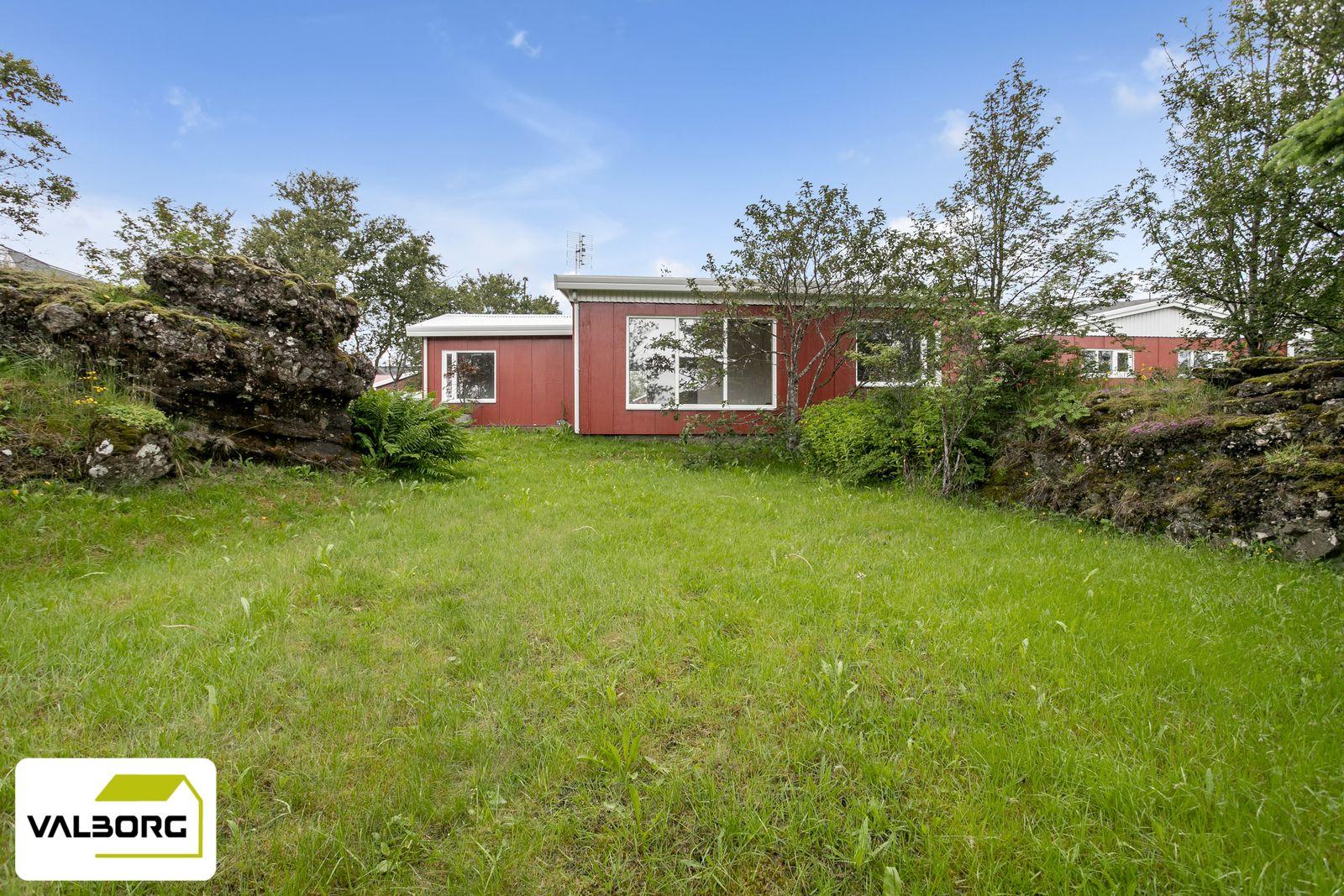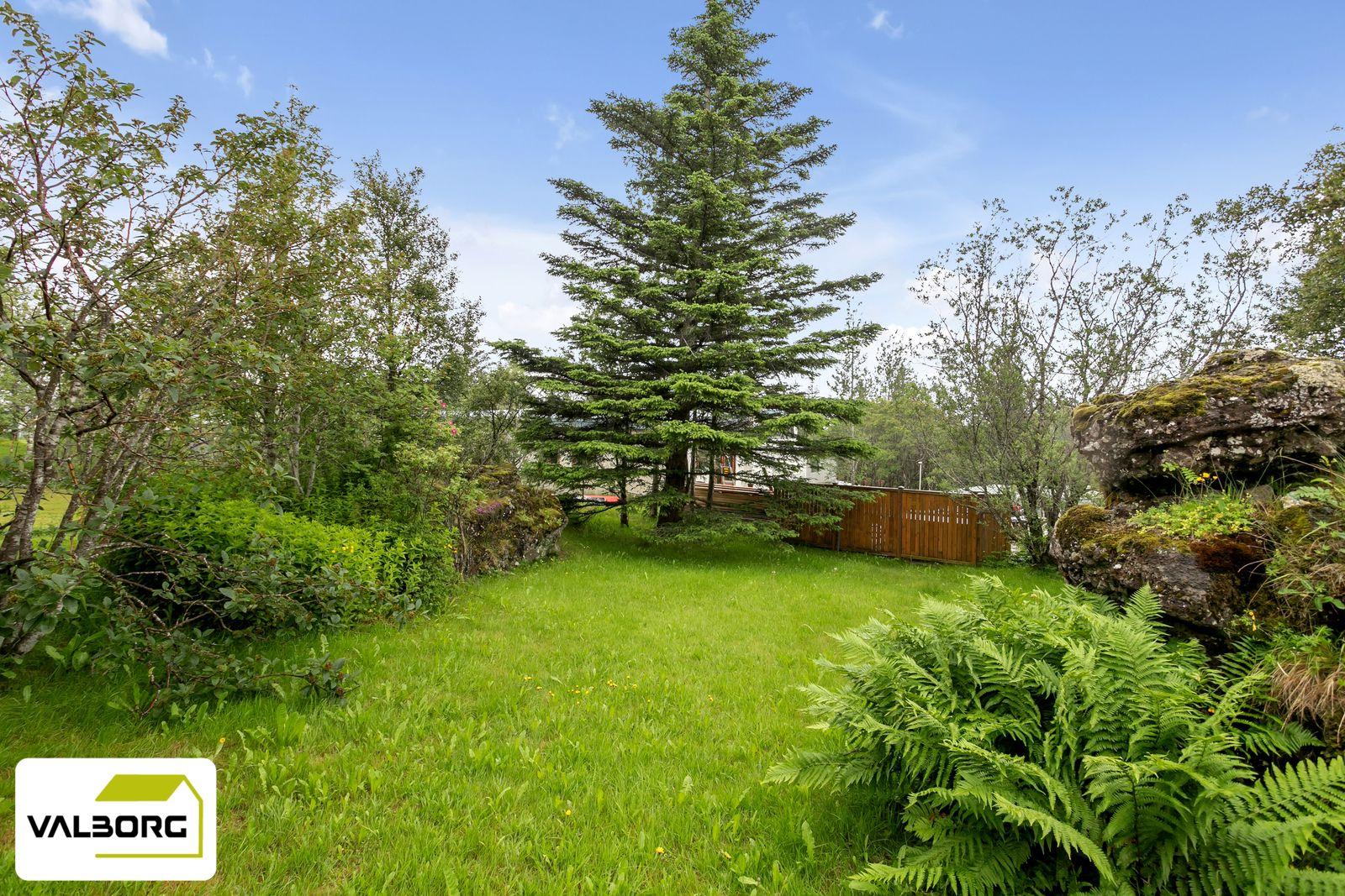 Lóð er tyrft og með töluverðum trjágróðri.