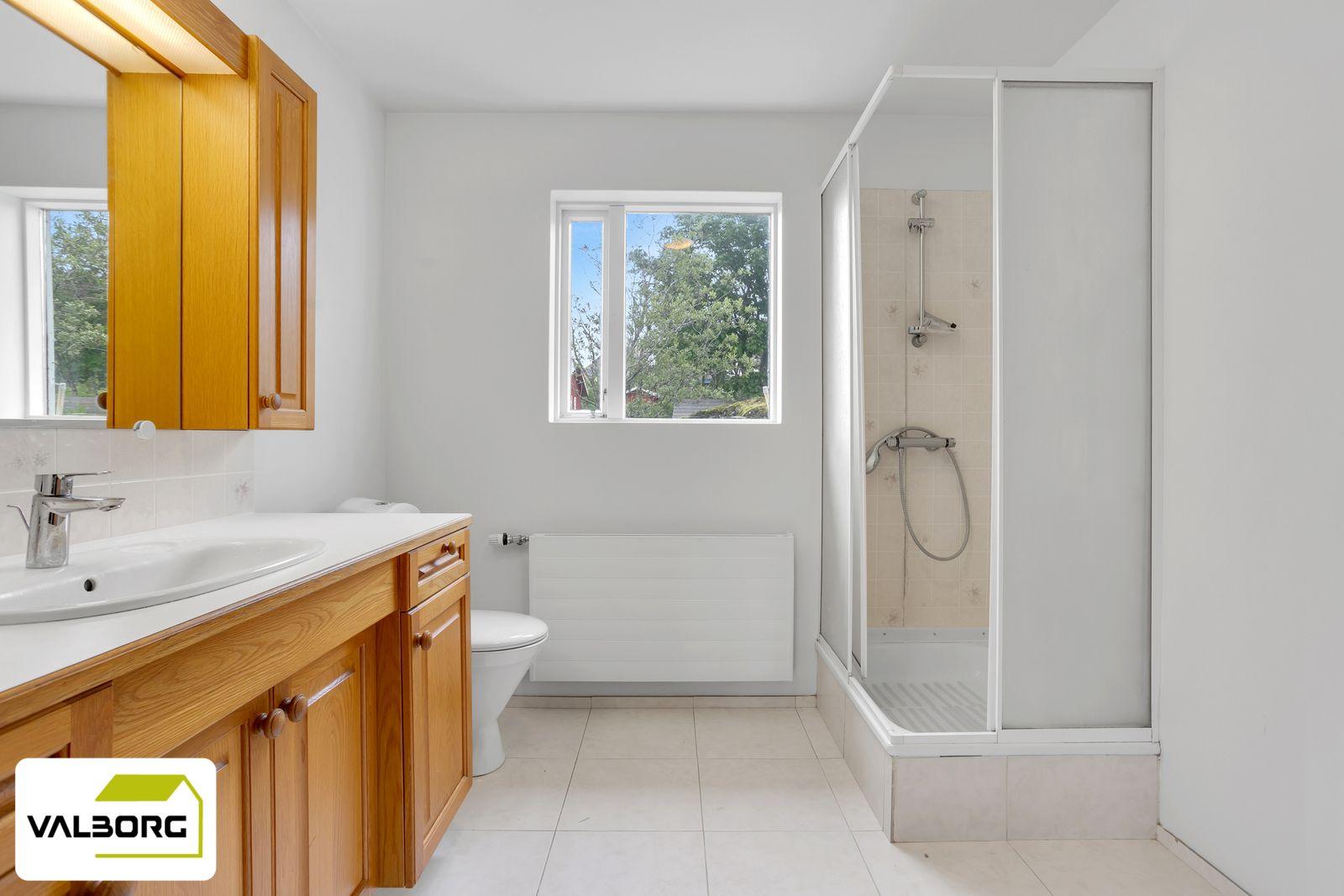 Baðherbergi er með flísalagt gólf en þar er innrétting með handlaug, skápa og skúffupláss, sturtuklefi og wc. Gert er ráð fyrir þvottavél á baðherbergi.