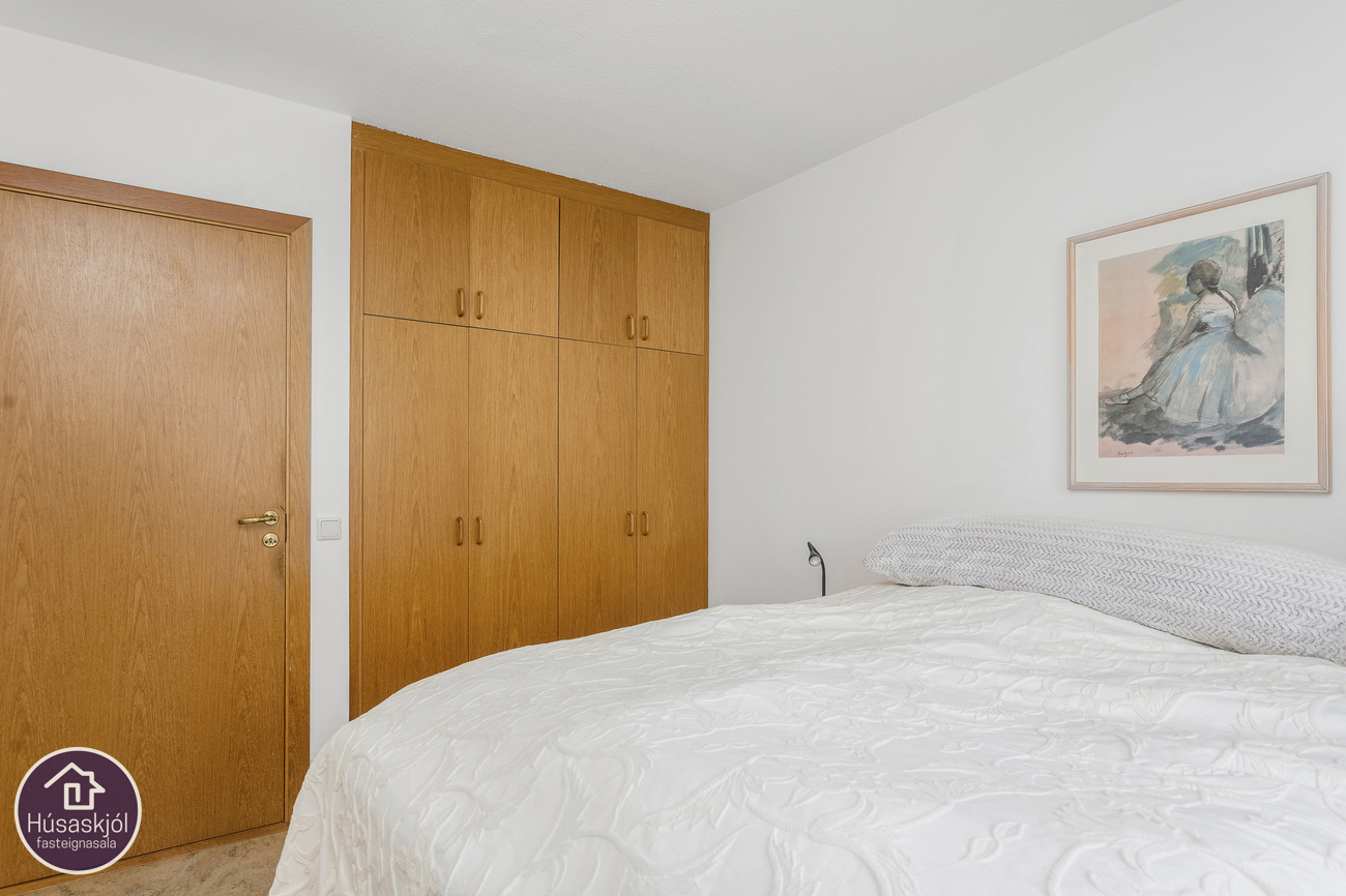 Svefnherbergið er rúmgott með góðum fataskápum.