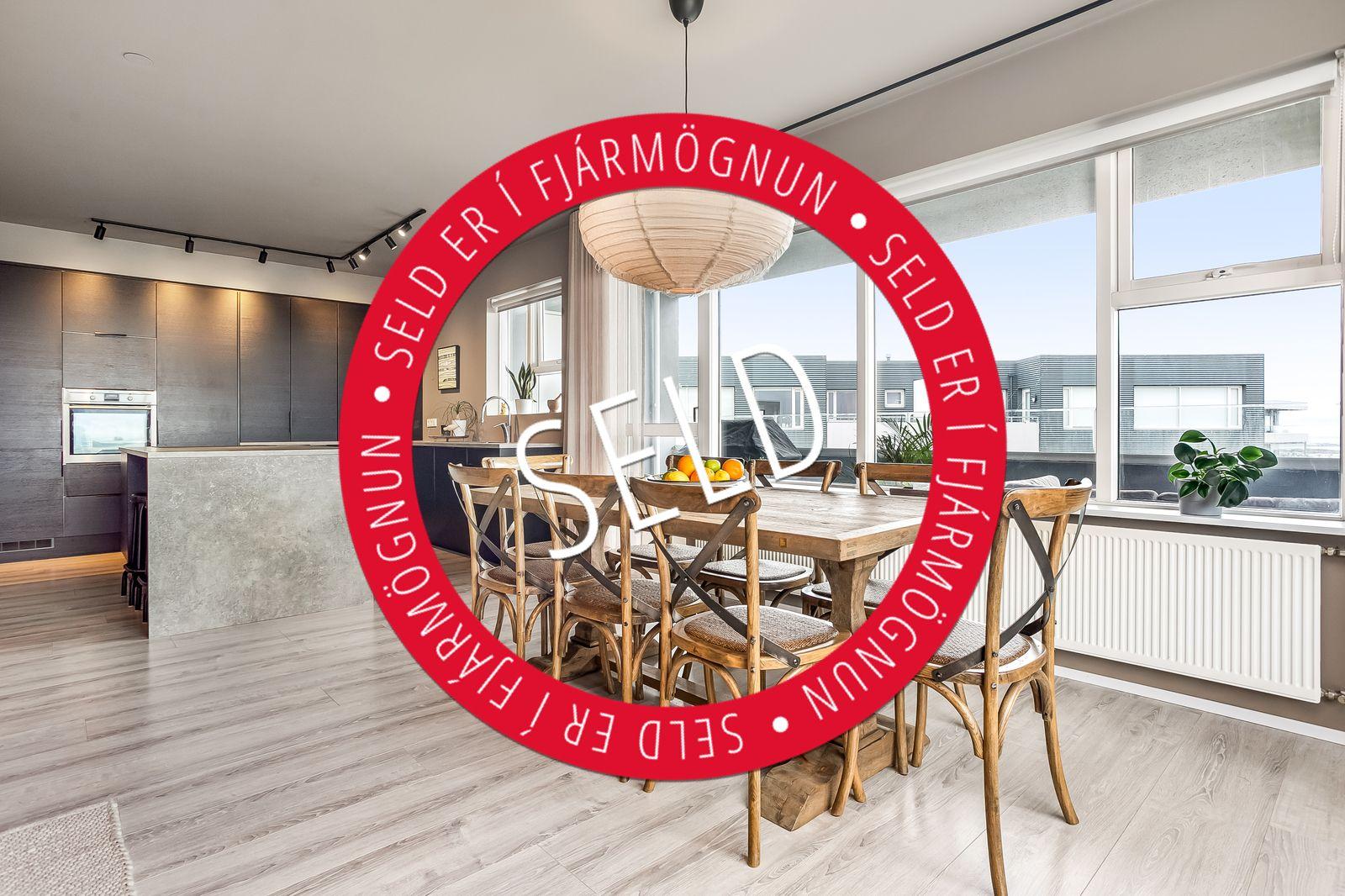 Eldhúsið er afar rúmgott með góðu vinnuplássi og fallegri nýlegri HTH innréttingu, innbyggður ísskápur með frysti ásamt innbyggðri uppþvottavél, stór tækjaskápur, stór eyja sem hægt er að sitja við, span helluborð, parket á gólfi,