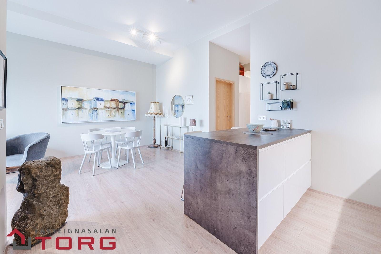 Eldhús. Hvít - háglansinnrétting með mikið hirslupláss. Grár eldhúsbekkur. Eyja við vegg með sætispláss fyrir þrjá. Bakaraofn, span-helluborð og loftgleypir. Innréttuð uppþvottavél og ísskápur.