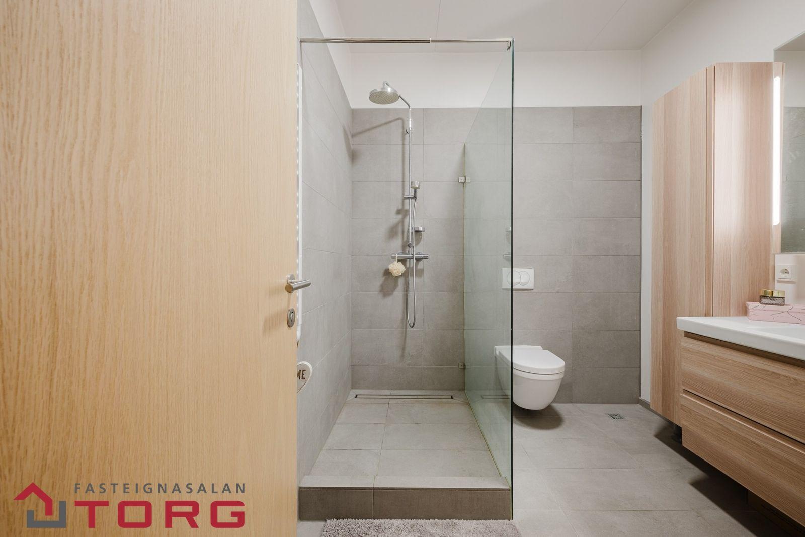 Baðherbergi. Fallegar gráleitar flísar á gólfi og í kringum "walk in" sturtu. Upphengt salerni, handklæðaofn, falleg viðarinnrétting, skápur, spegill með ljósum. Tengi fyrir þvottavél.