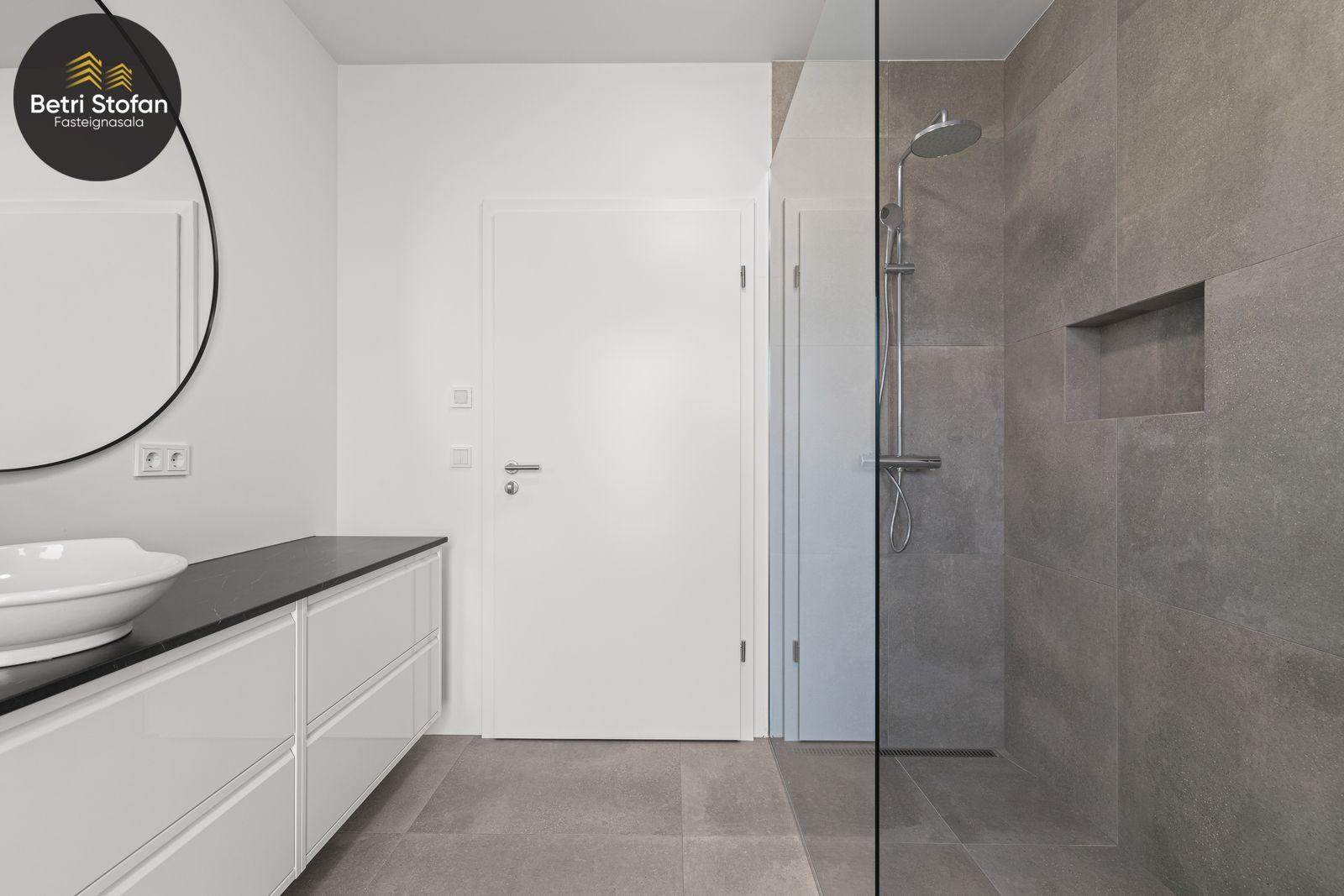 Baðherbergi: Rúmgott með opinni sturtu með glervegg og gólfhalla að niðurfalli, vegghengt salerni ásamt baðinnréttingu með skúffum undir vaski, dökkri borðplötu og stórum hringlaga spegli fyrir ofan vask. Flísar á gólfi og á vegg við sturtu.