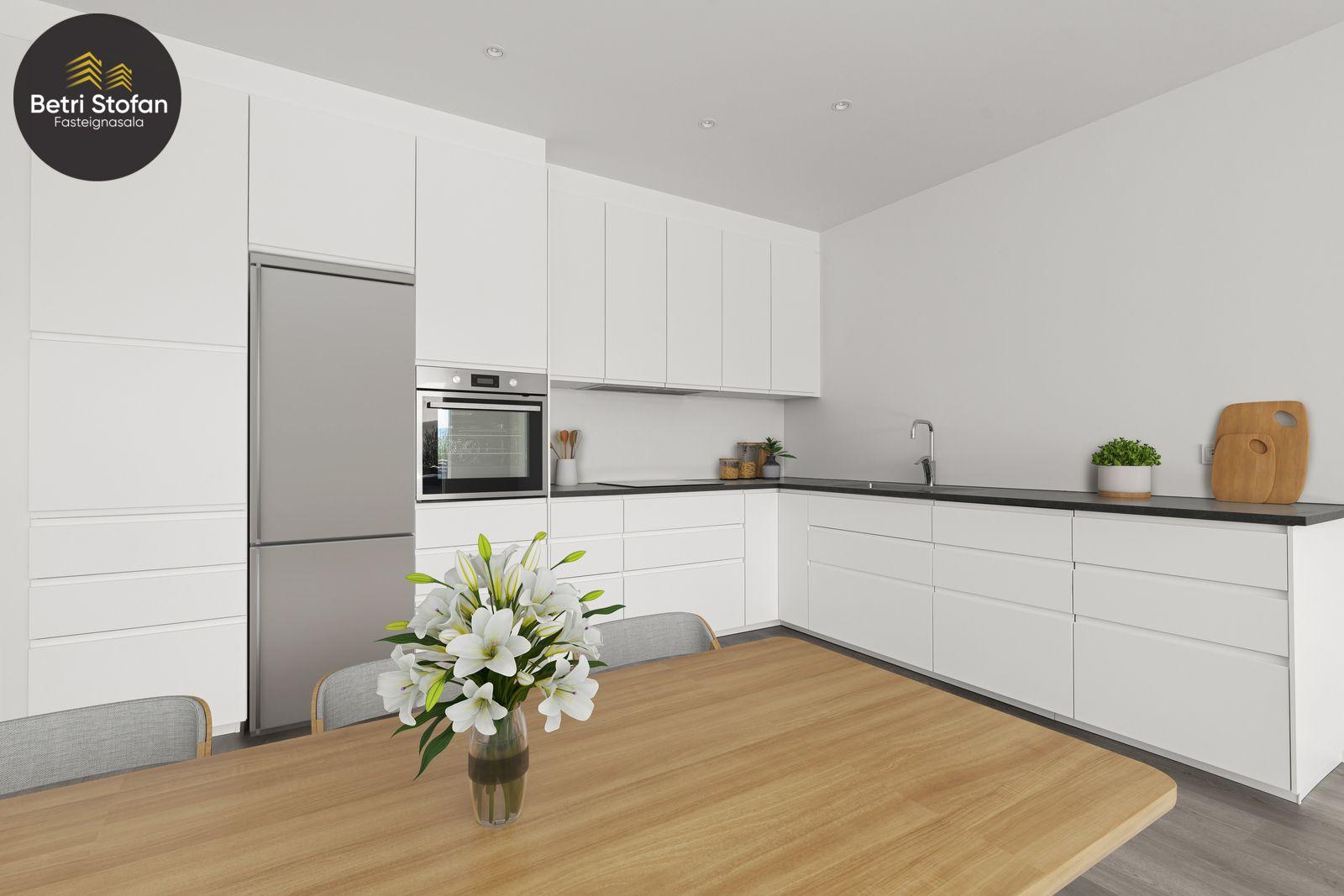 Eldhús: Ljós innrétting með efri og neðri skápum með dökkri borðplötu. Gott skápa og vinnupláss. Ofn í vinnuhæð, spanhelluborð með innbyggðum háf fyrir ofan, innbyggð uppþvottavélog vaskur. Aðstaða fyrir ísskáp í innréttingu.