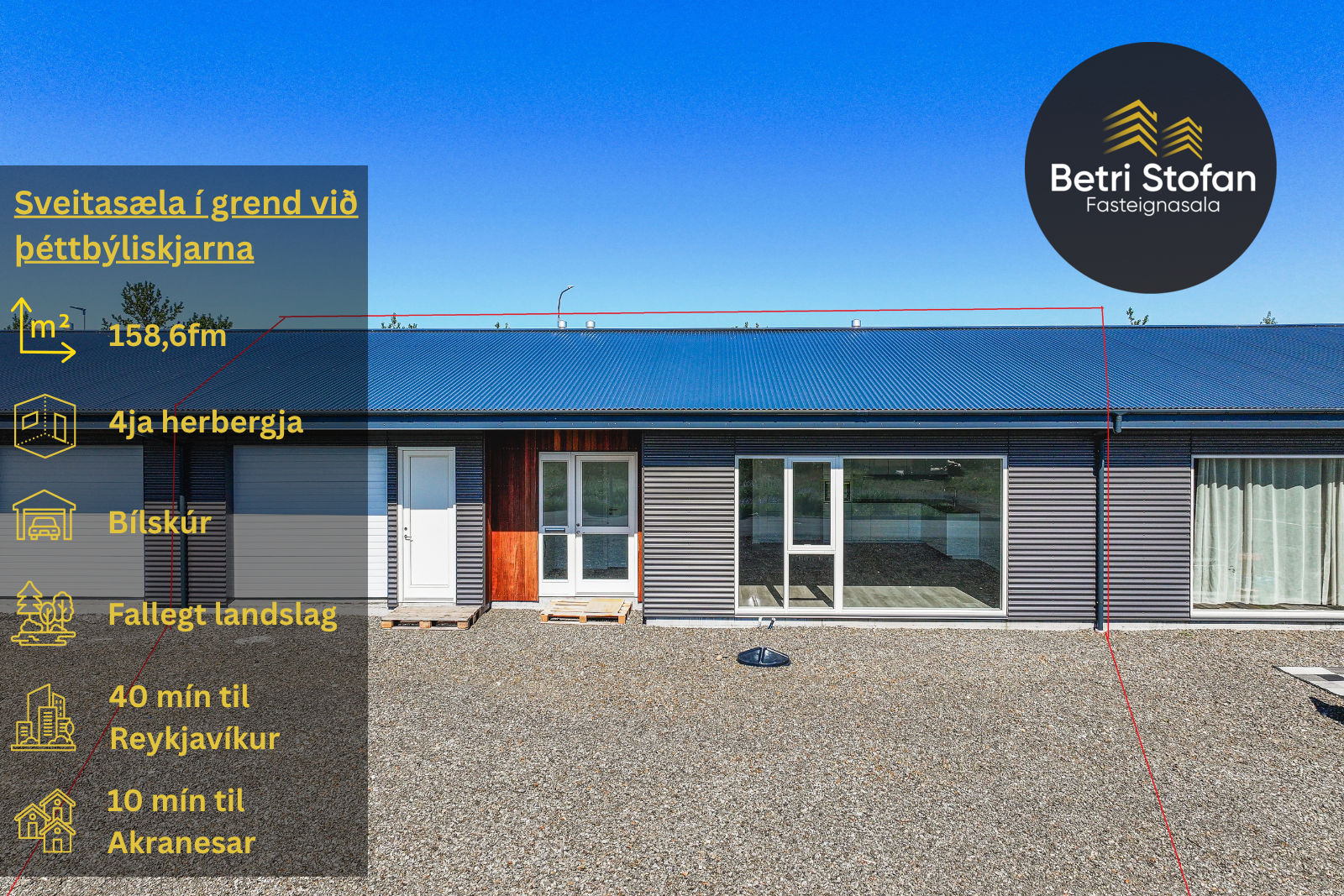 Betri Stofan Fasteignasala, Hreiðar Levý og Dagrún Davíðsdóttir lögg.fasteignasalar kynna nýtt og vel skipulagt 158,6fm, 4ja herbergja raðhús með innbyggðum 32,2fm á einni hæð að Háamel 1B í Melahverfi í Hvalfjarðarsveit. Húsið er timburhús, klætt með álbáru, á steyptri plötu með gólfhita. Eignin skiptist í þrjú svernherbergi með fataskápum, baðherbergi, gestasalerni, þvottahús, anddyri og bílskúr. Húsið afhendist fullbúið og innréttað á byggingarstigi B4, lóðin grófjöfnuð, búið að skipta um jarðveg og þjappa fyrir framan hús. Bílskúrinn er 32,2 fm með rafdrifinni bílskúrshurð ásamt sér gönguhurð við hlið hennar. Innangengt er úr húsi í bílskúrinn í gegnum þvottahúsið. Bílastæði fyrir framan bílskúr, Búið að skipta um jarðveg og þjappa. Þakið er lituð aluzinkbára og þakkantur með sléttu áli í sama lit. Innfelld lýsing og rafmagnstenglar eru undir þakkanti. Gólfhiti í öllu húsinu. Búið að gera lagnaleið fyrir heitan pott fyrir sunnan hús. Garður/lóðin snýr í vestur og suður og er henni skilað grófjafnaðri.