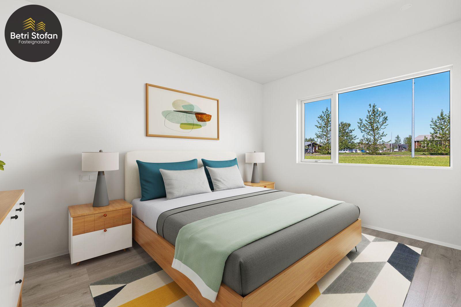 Gólfefni: Flísar og parket er frá Álfaborg. Vandað harðparket er á gólfum svefnherbergja og alrými. Flísar á gólfum í þvottahúsi, forstofu, baðherbergi og gestasalerni. Epoxy á bílskúrsgólfi.