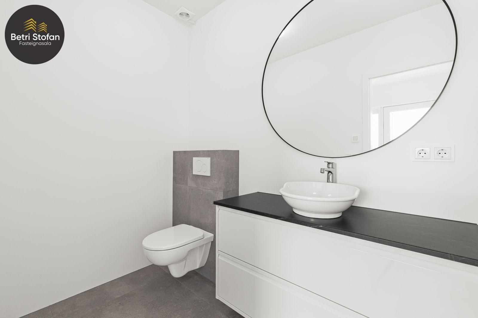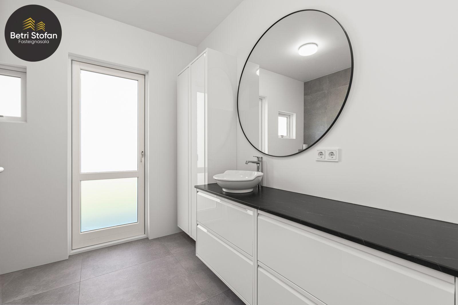 Gestasalerni: Vegghengt salerni, baðinnrétting með skúffum, dökkri borðplötu og vaski. Stór hringlaga spegill fyrir ofan vask.